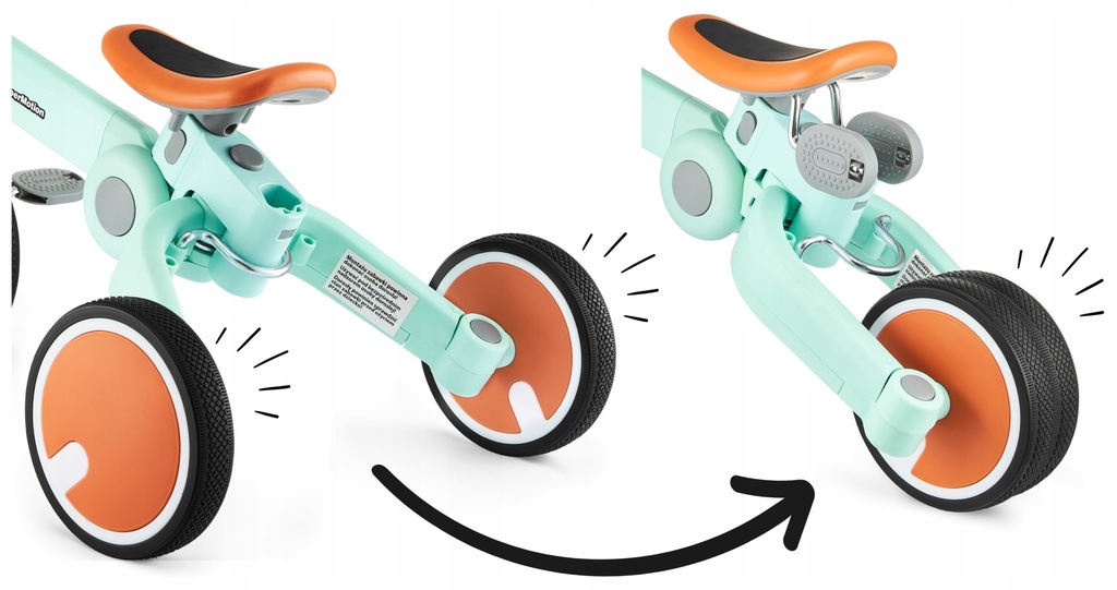 Twój maluszek znudził się jazdą na rowerku trójkołowym? Nic prostszego! Wystarczy obrócić koła, złączyć je ze sobą aż usłyszysz „klik”, a następnie zablokować łącznikiem i gotowe.