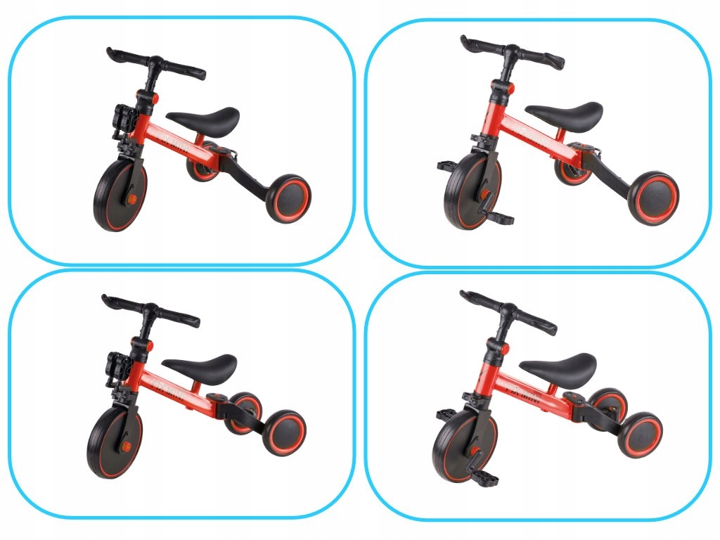 ROWEREK TRIKE FIX MINI BIEGOWY TRÓJKOŁOWY 3W1 Z PEDAŁAMI CZERWONYOlbrzymia prędkość, adrenalina, wiatr we włosach (oczywiście przez dziurki w kasku) i świetne emocje! To wszystko zapewni Twojemu dziecku ten produkt!Rowerek trójkołowy 3w1 Trike Fix Mini oferuje wiele interesujących możliwości! Zamieni się w trzy różne pojazdy, zależnie od preferencji dziecka i rodzica! Pierwszym z nich jest trójkołowy rowerek biegowy! Gdy zamontujesz pedały w specjalne uchwyty i rozłożysz koła na boki, powstanie wygodny, stabilny pojazd, świetny na pierwszy przygody na kółkach! Gdy opanuje poruszanie się w pierwszej formie, czas na drugą - czyli na rowerek trójkołowy! Zamontuj pedały w gniazdach na przednim kole i pozwól ruszyć dziecku w siną dal! Na samym końcu Twojego malucha czeka najtrudniejsze zadanie - tylne koła możesz złożyć tak, aby znajdowały się blisko siebie. Będzie wymagało to od dziecka utrzymania równowagi i zapewni mu świetną lekcję przed jazdą na prawdziwym dwukołowym rowerze! Konstrukcja pozwala na pełną regulację kierownicy od 41 cm do 50 cm i siodełka w zakresie 31 - 38 cm. Pozwoli to na dobranie wysokości idealnie do użytkownika, zapewniając wygodę i bezpieczeństwo. Produkt sprawdzi się dla każdego dziecka w wieku od 18 miesięcy aż do 4 roku życia! Przez ten długi okres zapewni mu ogromną ilość ciekawych i przyjemnych chwil! Maksymalne obciążenie wynosi 30 kg,nie musisz się więc martwić, że dziecko uszkodzi rowerek! Ciekawy designprzyciągnie uwagę najmłodszych kolarzy i zachęci ich do zabawy!Prosta forma i nowoczesny styl spodobają się także rodzicom! Taki trójkołowy rowerek stanowi naprawdę świetny wybór dla każdego! Przede wszystkim warto pamiętać, że ruch to zdrowie! Zabawka, która zachęci malucha do spacerów i aktywności fizycznej pomoże w odpowiednim rozwoju i zachowaniu poprawnej kondycji! Rozwinie też poczucie równowagi, mięśnie całego ciała i koordynację ruchową!Będzie to również świetny sposób, aby przedstawić maluchowi zasady ruchu drogowego oraz bezpiecznego poruszania się po chodniku! Nauka poprzez zabawę zapewni trwałe efekty! Materiały zastosowane do stworzenia produktu zapewniają mu wysoką trwałość - na pewno przetrwa niejedną rodzinną wycieczkę!