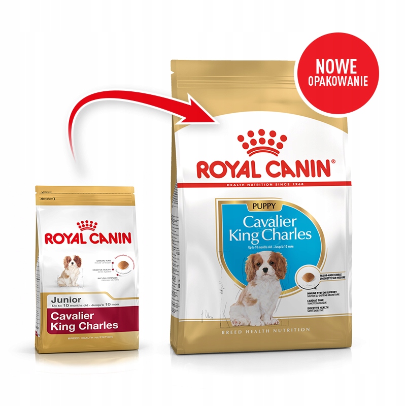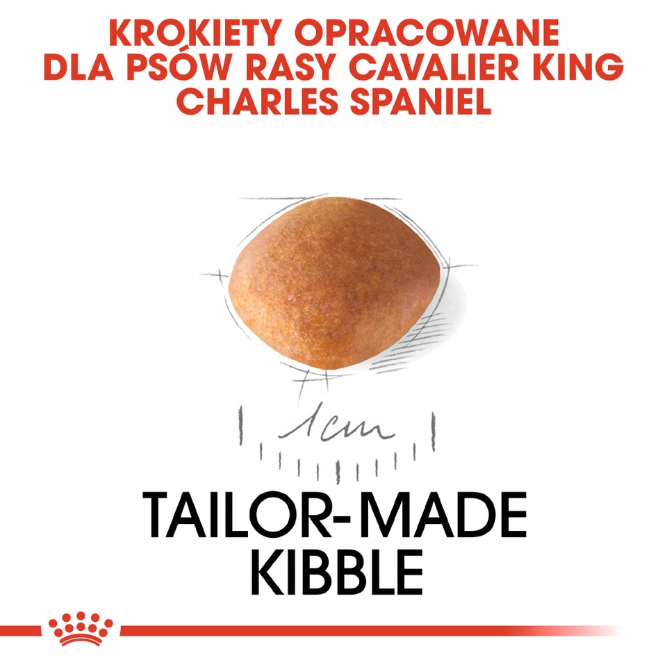 Sucha karma dla psów rasy Cavalier King Charles w okresie szczenięcym. Psy tej rasy mają skłonność do problemów z sercem, szczególna uwagą powinien zostać również objęty stan ich układu trawiennego. Ze względu na spokojny tryb życia i niewielką ilość ruchu w okresie dorosłości, psy te mogą cierpieć na problemy związane z nadwagą. Cavalier King Charles Spaniel ma długą, jedwabistą i miękką sierść oraz małą szczękę z blisko osadzonymi zębami, które wymagają pielęgnacji również w okrasie dorastania. Karmę cechuje odpowiednią ilość składników odżywczych, w tym minerałów, kwasów EPA (kwas eikozapentaenowy) i DHA (kwas dokozaheksaenowy), tauryny, L-karnityny oraz przeciwutleniaczy, wspomaga to funkcjonowanie serca. Specjalna formuła wspomaga procesy trawienne i pomaga w utrzymaniu odpowiedniego balansu flory jelitowej. Aktywuje to naturalne siły obronne organizmu. Krokiety dopasowane do zgryzu odznaczają się specjalną tekstura, która jest bogata w wapń zapobiegający powstawaniu kamienia nazębnego.