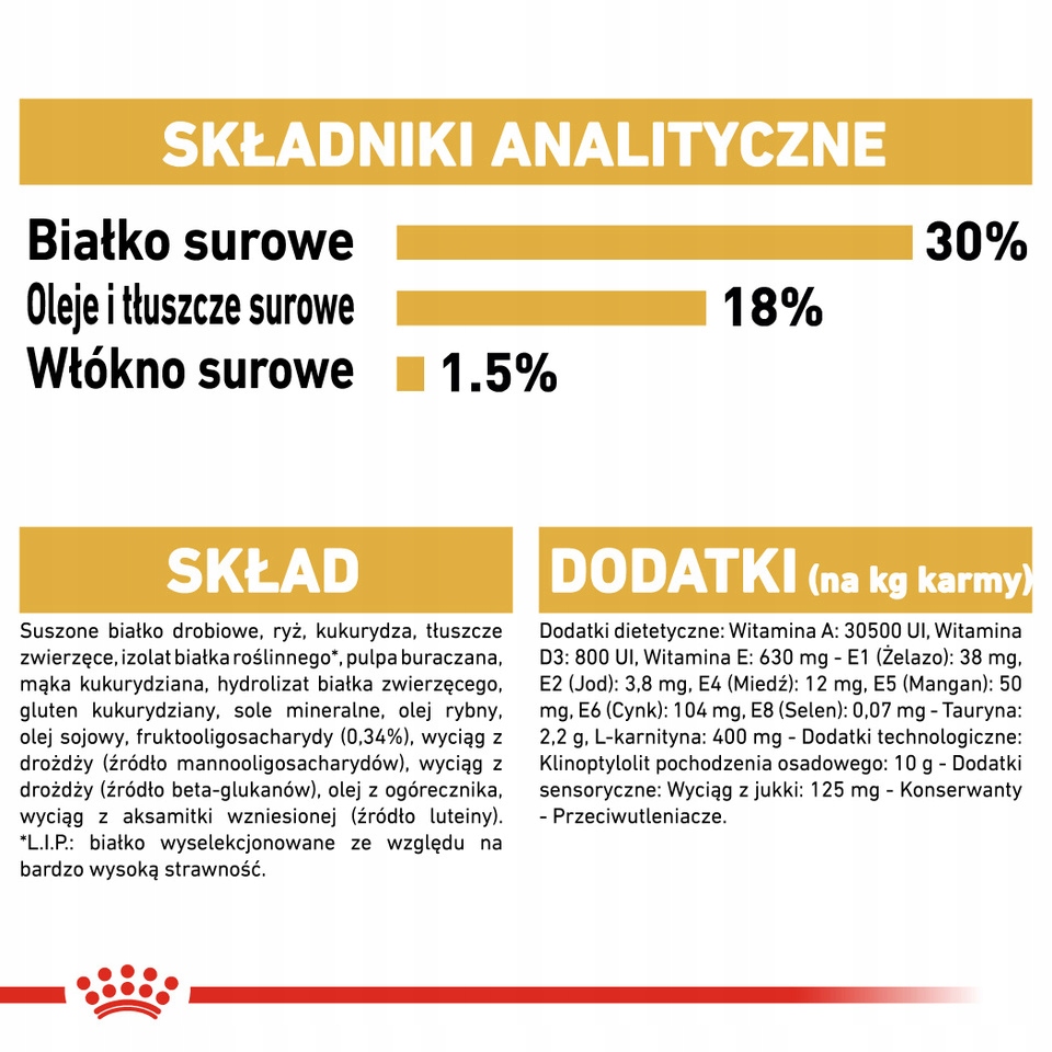 SkładOdwodnione białko drobiowe, ryż, kukurydza, tłuszcze zwierzęce, izolowane białka roślinne, pulpa buraczana, mąka kukurydziana, gluten kukurydziany, hydrolizowane białka zwierzęce, sole mineralne, tran, olej sojowy, fruktooligosacharydy-oligosacharydów, hydrolizowane drożdże (źródło manno-oligosacharydów), olej z ogórecznika, wyciąg z nagietka (źródło luteiny).