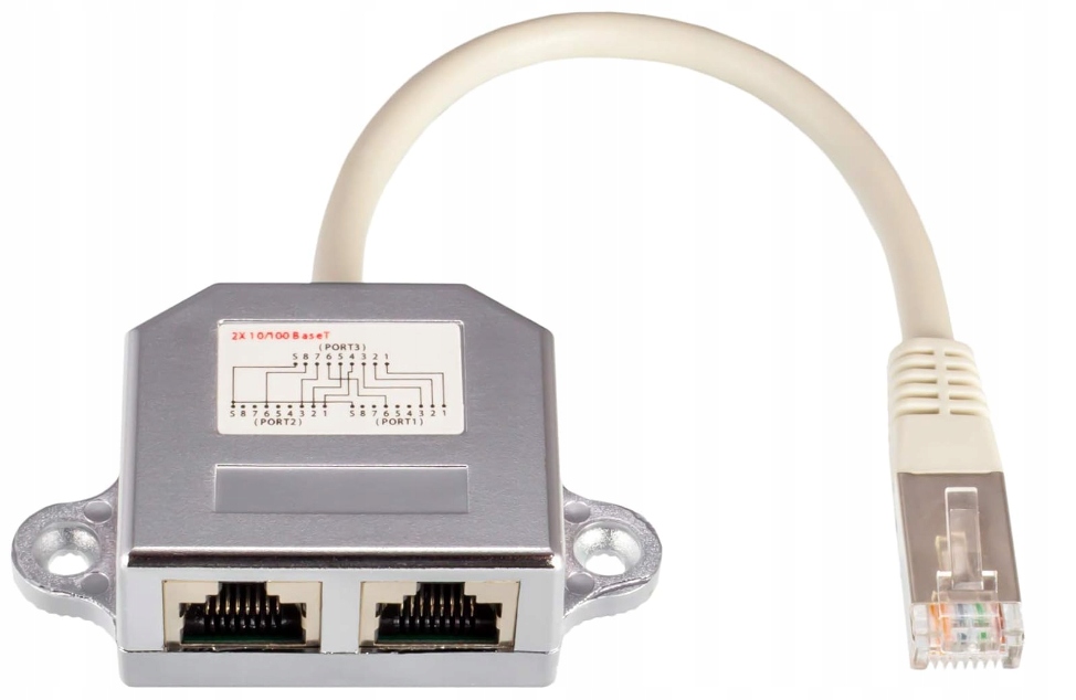Do transmisji danych 100 Mbit/s (10BASE-T, 100BASE-TX) używa się tylko 4 z 8 przewodów w jednym kablu sieciowym (1., 2., 3. i 6.). Nasz rozdzielacz sieciowy przekazuje sygnały z 4 używanych żył do 2 niezależnych kabli sieciowych za pomocą jednego standardowego kabla sieciowego z 8-żyłami. Na końcu drugiego adaptera ponownie podłącz sygnał do 2 niezależnych kabli sieciowych.