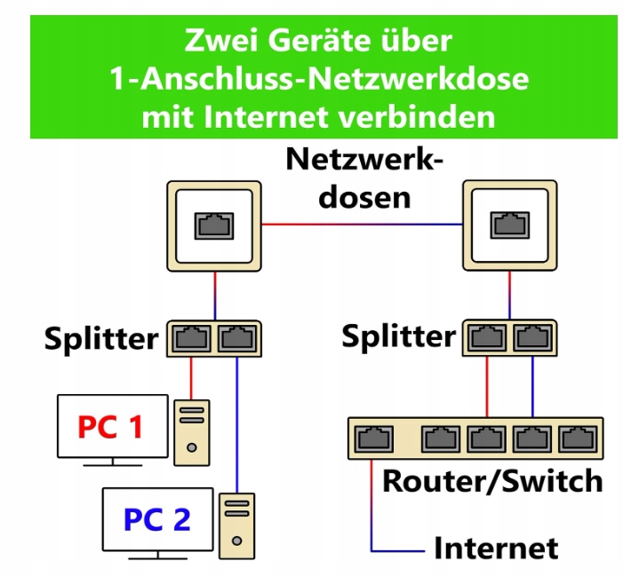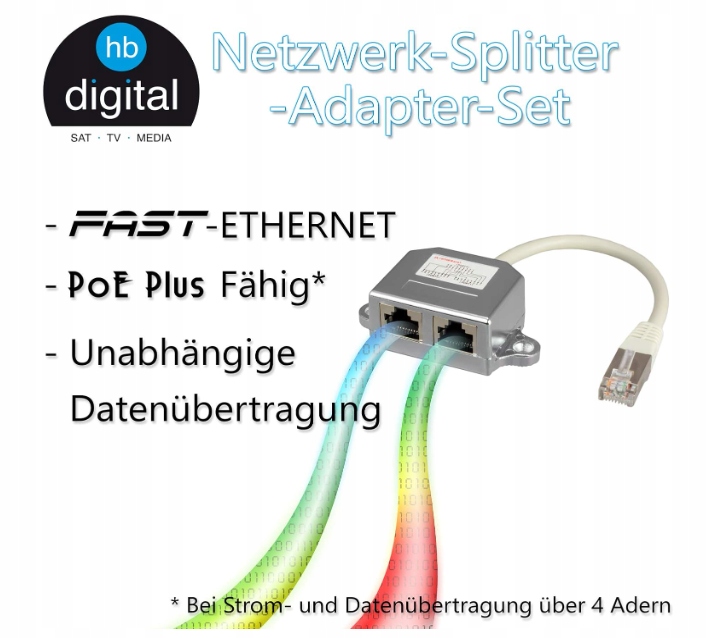 Do bezbłędnego transferu danych konieczne są obydwa adaptery. Sygnały obu kabli nie są mieszane. Jeśli potrzebujesz wyższych prędkości transmisji niż 100 Mbit/s, użyj więcej niż 4 żył kablowych. Połącz oba urządzenia za pomocą 2 kabli sieciowych z naszym adapterem. Podłącz adapter do gniazdka sieciowego, które prowadzi do Internetu. Za pomocą drugiego adapteru rozdzielaj sygnały na 2 niezależne kable sieciowe. Połącz dwa kable sieciowe z routerem i Gotowe!