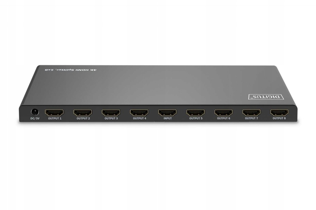 Splitter (rozdzielacz) HDMI DIGITUS rozdziela/duplikuje sygnały audio i wideo z urządzenia HDMI do 8 telewizorów, monitorów lub projektorów w jakości UHD 4K / 60 Hz. Korzystając z funkcji zarządzania EDID, możesz wybrać jeden z 3 trybów (Copy, Auto, Downscaler). Zintegrowana funkcja downscaling obsługuje wyświetlanie 4K na wyświetlaczach Full HD. Zarówno wyświetlacz 4K jak i Full HD mogą być dodatkowo obsługiwane jednocześnie. Dzięki funkcji Auto-EDID rozgałęźnik automatycznie wykrywa podłączone wyświetlacze - nie ma potrzeby dokonywania ręcznych regulacji.