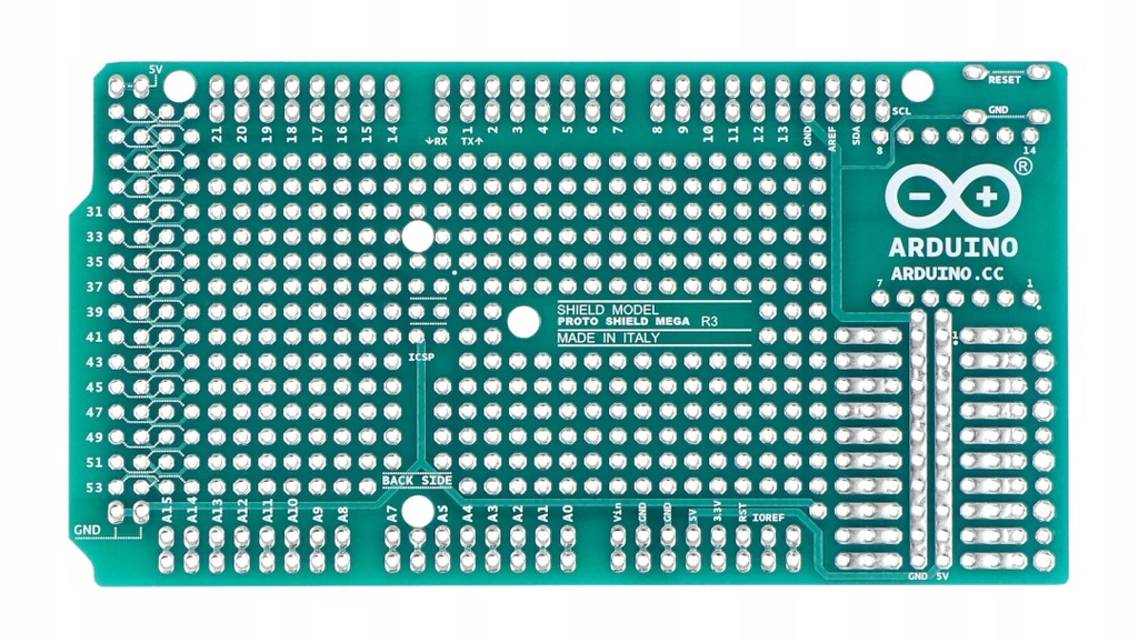 Nakładka na Arduino Mega pozwalająca tworzyć własne układy (shieldy). Model przystosowany do najnowszych wersji rodziny Arduino Mega Rev3.