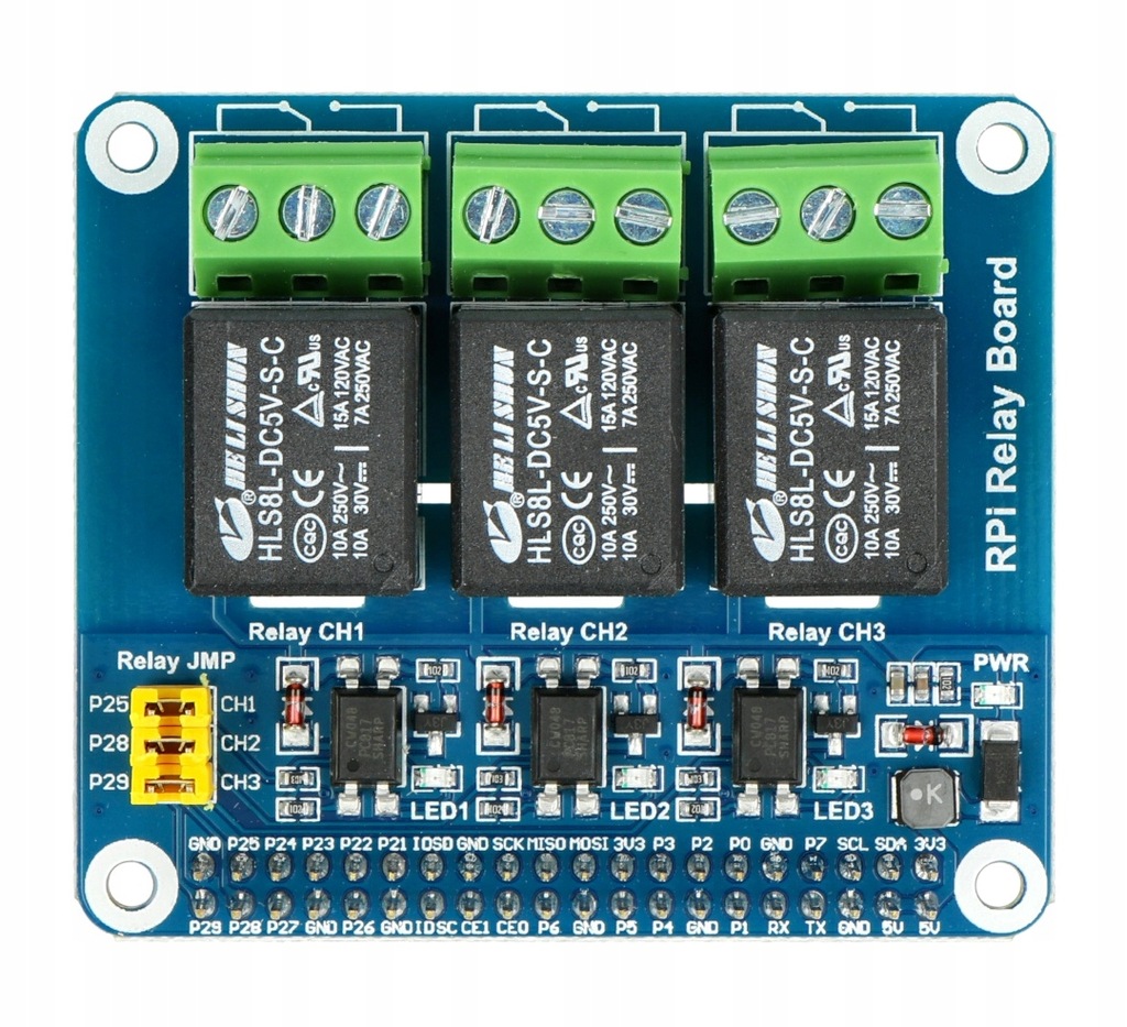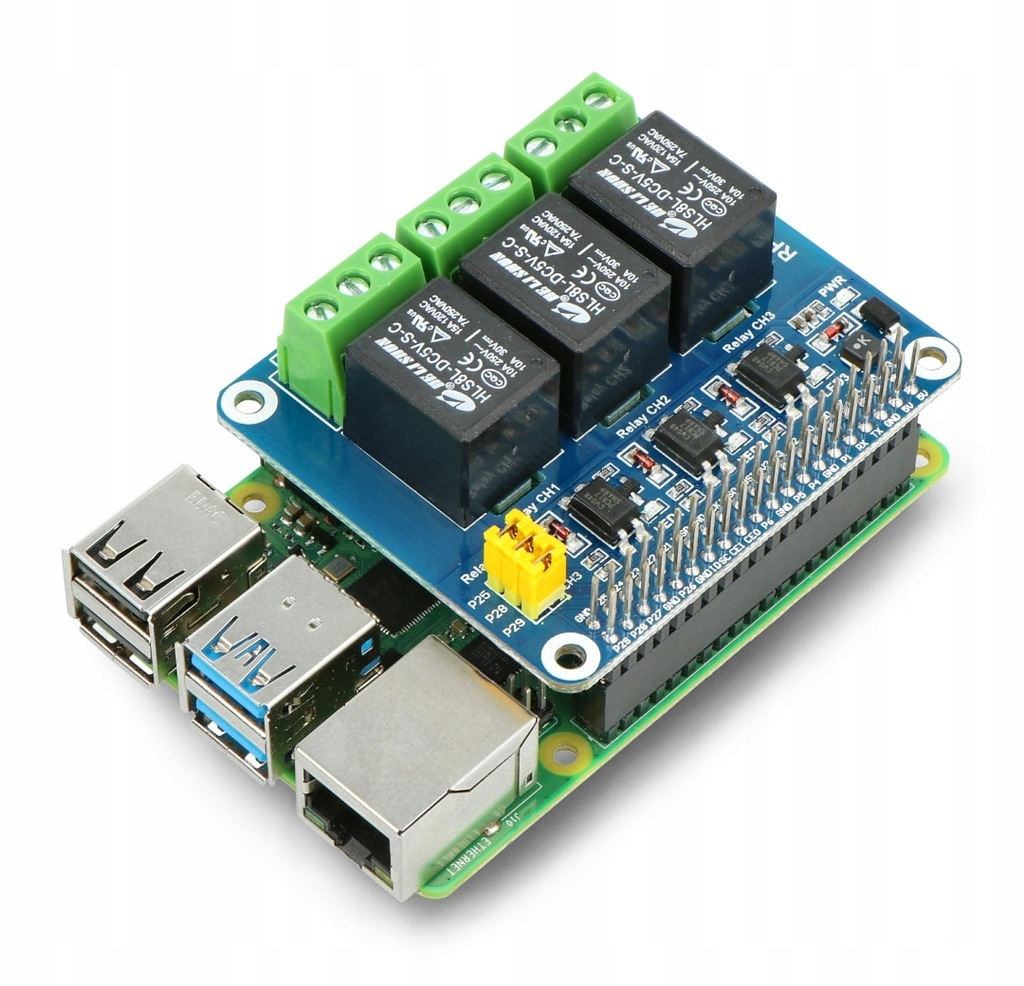 Nakładka dopasowana do z łącz GPIO Raspberry Pi w wersji 4B, 3B+, 3B, 2B, B+ oraz A+, z trzema przekaźnikami o parametrach 250 V / 10 A. Płytka posiada złącze śrubowe. Komunikuje się poprzez sygnały cyfrowe.