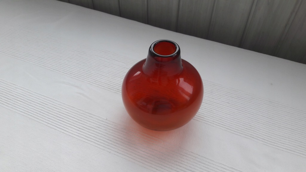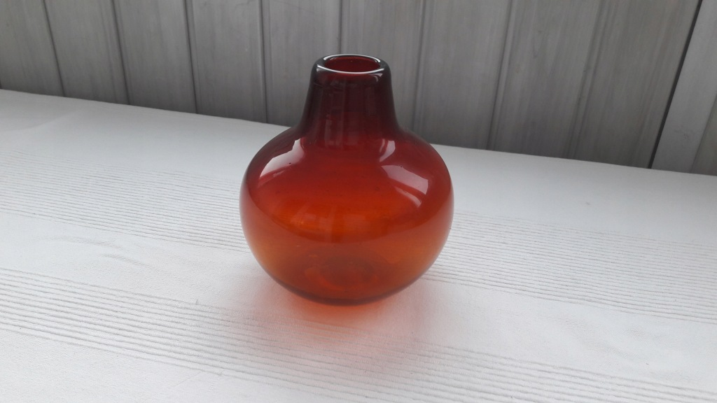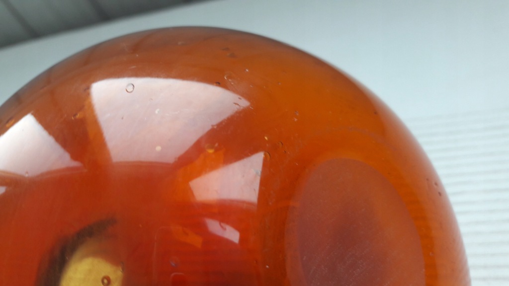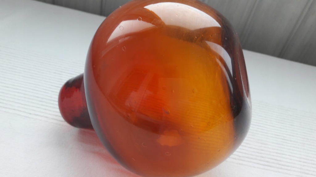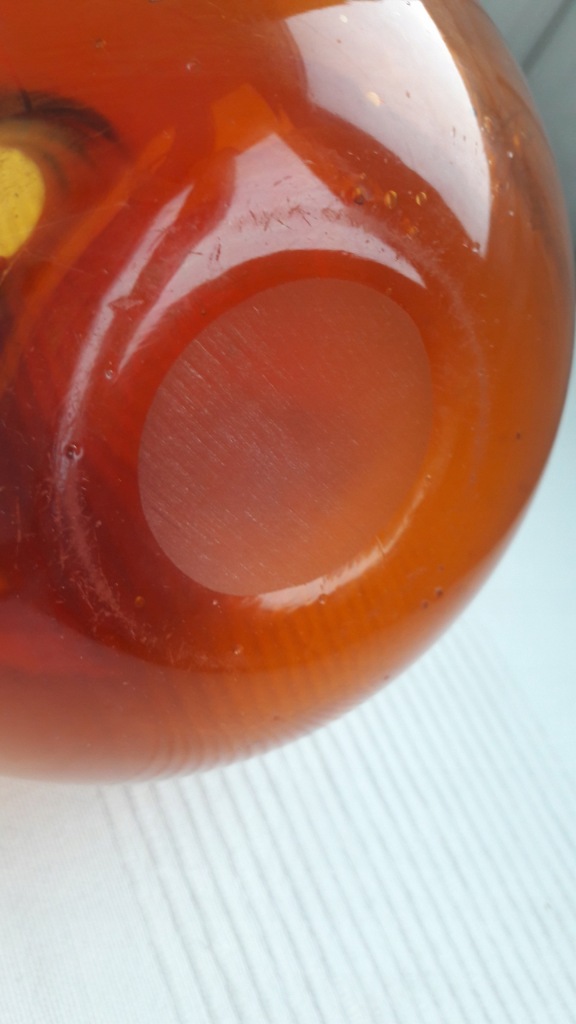 Butla dekoracyjna, szkło barwione w masie na kolor rubinowo miodowy,dolna część miodowa, idąc w górę - przechodzi w rubin.Szeroki brzusiec ze zwężoną szyjką, na zewnętrzej dolnej części,widoczna soczewka po piszczeli hutniczej, w szkle występują liczne pęcherzyki powietrza.