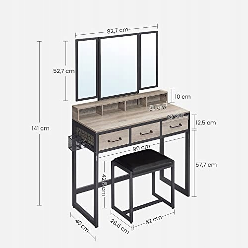 RVT004B02 Toaletka z wyściełanym stołkiem, potrójne lustro, 3 szuflady, uchwyt na suszarkę do włosów, garnek, styl industrialny, szary i czarny