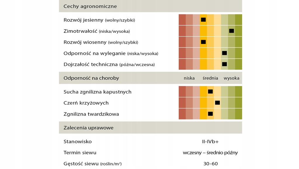 Rzepak cechuje dobra zimotrwałość, wysoka odporność na wyleganie oraz wysoka zawartość oleju w nasionach. Stanowisko uprawy typowe dla rzepaku, klasa II-IVb. Odmiana udaje się również na przeciętnych stanowiskach.