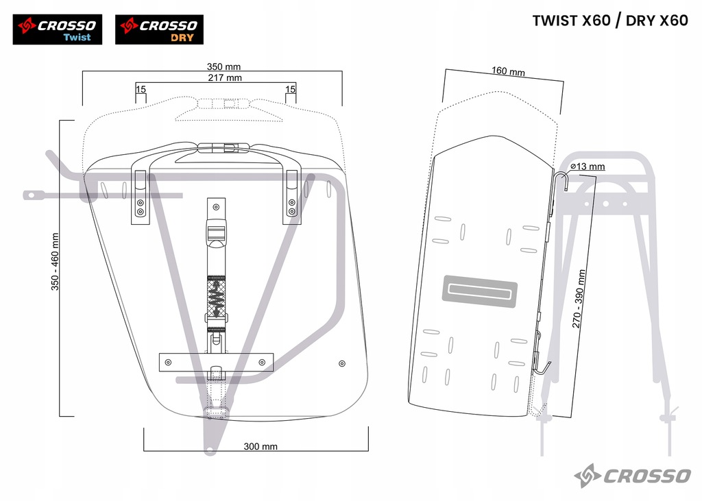Sakwy wyposażone są w SYSTEM NOŚNY CROSSO - łączy w sobie prostotę i funkcjonalność. Założenie sakw trwa dosłownie jedną chwilę, po czym cały ładunek trzyma się pewnie na bagażniku. Stalowe haki oznaczają niezrównaną wytrzymałość i niezawodność, potwierdzoną podczas wypraw w najdalsze rejony świata.