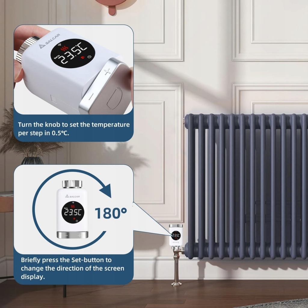 - Oszczędność energii: termostat SALCAR ogrzewa swój dom do odpowiedniej temperatury tylko w razie potrzeby, aby zaoszczędzić energię do 30% i jednocześnie cieszyć się przyjemną temperaturą w pomieszczeniu. Obsługuje funkcję rozpoznawania okien. Zawór regulacji temperatury SALCAR można zainstalować za pomocą trzech baterii alkalicznych AA 1,5 V, co zmniejsza częstotliwość wymiany baterii (baterie wchodzą w zakres dostawy).