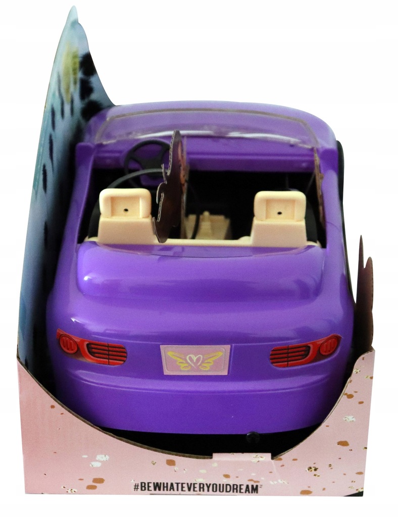 • Kabriolet ma błyszczącą fioletową karoserię i nowoczesne wnętrze, otwarty dach oraz srebrzyste felgi i kalkomanie na reflektorach • Samochód ma realistyczną tapicerkę, lusterka boczne i siedzenia z pasami bezpieczeństwa • Realistyczne ruchome koła są gotowe do podróży do następnego celu • Dwumiejscowy samochód pasuje do większości modnych lalek 11,5″