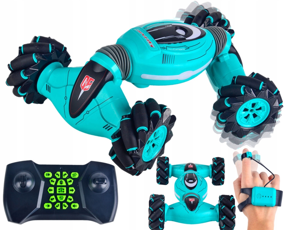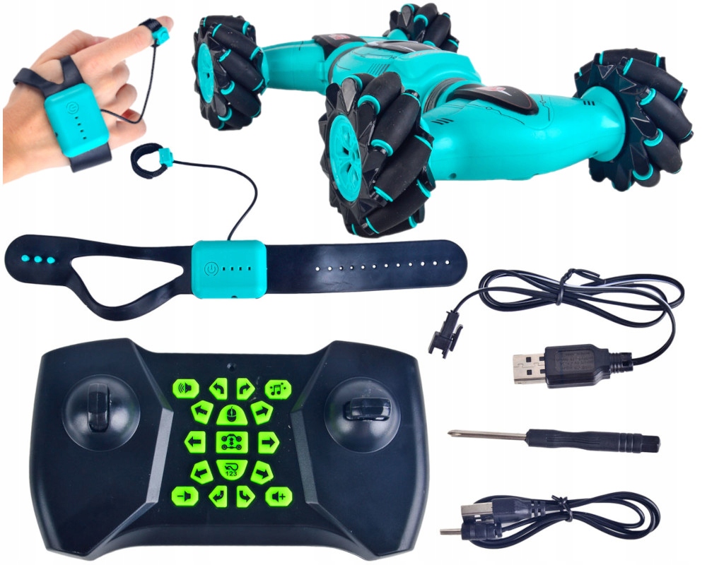 DOUBLE-SIDED można też sterować specjalną opaską grawitacyjną. Po założeniu jej na rękę, pilot wykonuje odpowiednie ruchy / gesty ręką i steruje zabawką. Aby przełączyć się na sterowanie grawitacyjne, należy wyłączyć pilot przyciskiem z symbolem "myszki komputerowej".