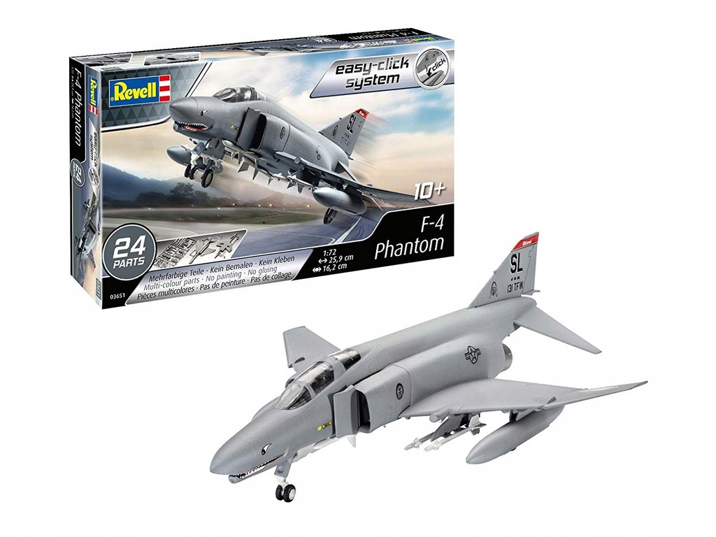 F-4E Phantom - dwumiejscowy naddżwiękowy samolot myśliwsko bombowy. W modelu zastosowano innowacyjny Easy-Click-System, nie wymaga się użycia kleju przy montażu modelu. Zalecane kolory farb: 32105, 32109, 32139, 32176, 32191. Plastikowy model do składania Revell ( REV-03651 ) nie zawiera farb. Specyfikacja Numer katalogowy:REV-03651 Producent: Revell Wymiary: 311x183x46 Długość: 259 mm Rozpiętość skrzydeł: 162 mm Wysokość: 62 mm Skala: 1:72 Ilość elementów: 24 Instrukcja: tak Grupa wiekowa: 10+