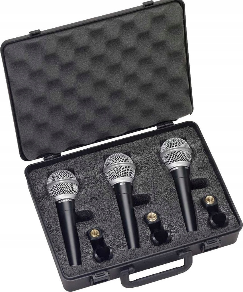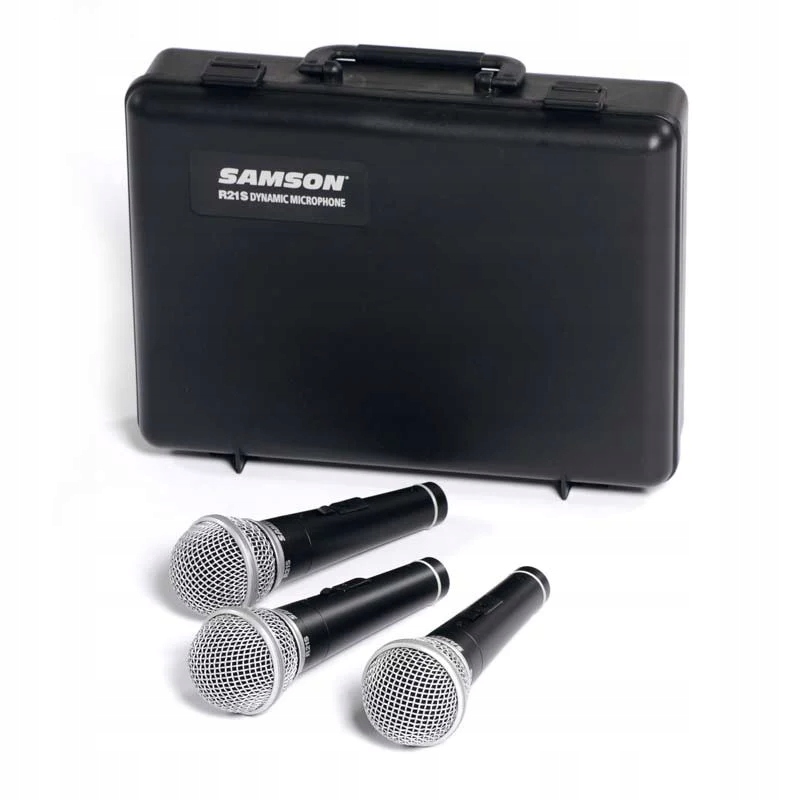 - nazwa przedmiotu: Samson Cardioid Mikrofony dynamiczne z pokrowcem (3 sztuki)