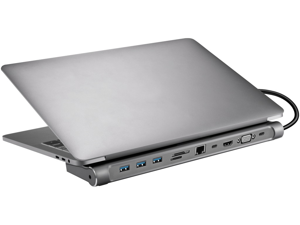 - punkt znaku wypunktowania: Aluminiowa obudowa, Wejście: USB-C męski, Wyjście: 1 x USB-C żeński (power supporting up to 100W), 1 x HDMI żeński, 1 x VGA żeński, 3 x USB 3.0 A żeński, 1 x RJ45 female, 1 x wyjście audio, 1 x czytnik kart SD obsługuje SD/SDHC/SDXC/MMC, Gniazdo kart Micro SD/TF