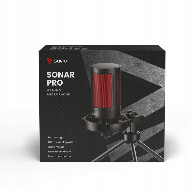 Savio wired gaming microphone with backlight tripod USB SONAR PRO. Model: Mikrofon do konsoli do gier. Technologia łączności: Przewodowa, Interfejs urządzenia: 3,5 mm (1/8"). Kolor produktu: Czarny, Czerwony. Źródło zasilania: USB