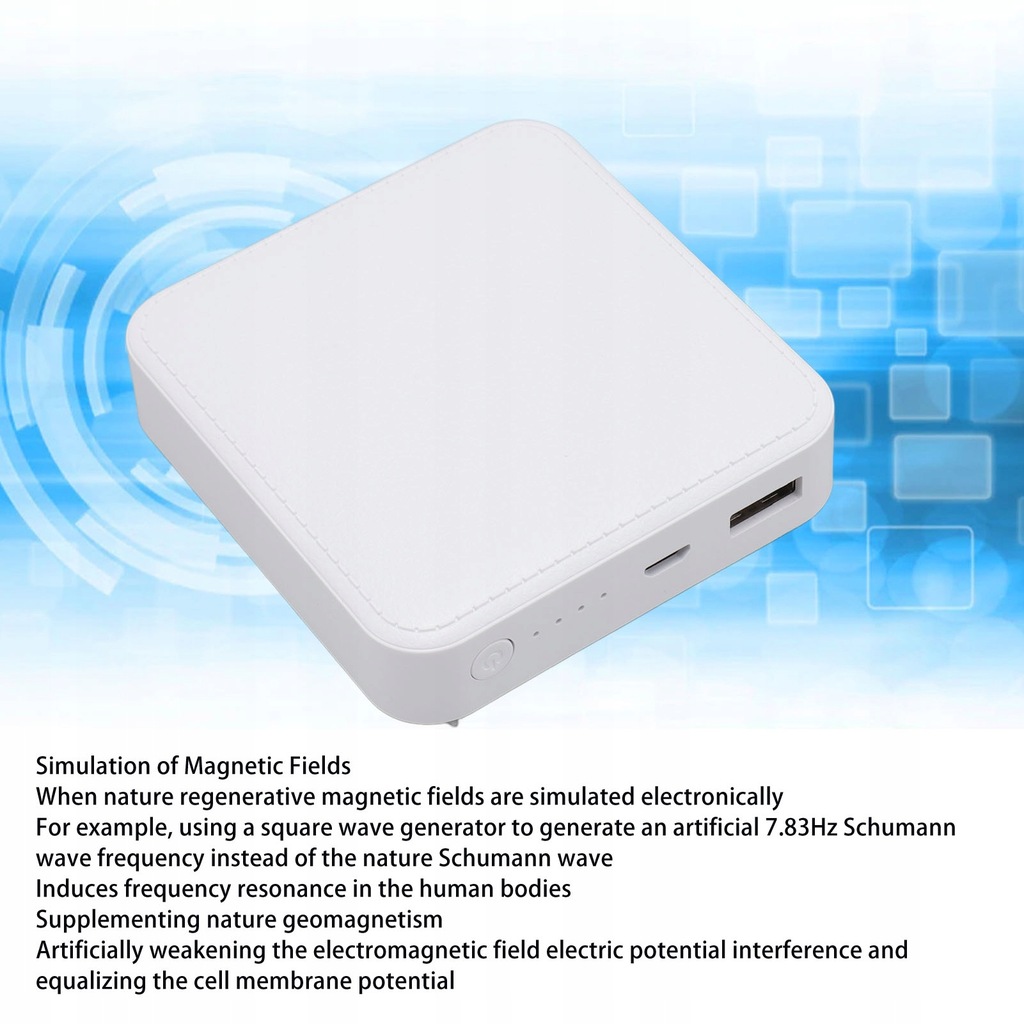 4. Symulowane pole magnetyczne: Podczas symulacji naturalnego pola magnetycznego regenerującego się za pomocą środków elektronicznych, na przykład przy użyciu generatora fali prostokątnej w celu wygenerowania sztucznej fali Schumanna o częstotliwości 7,83 Hz zamiast naturalnej fali Schumanna.