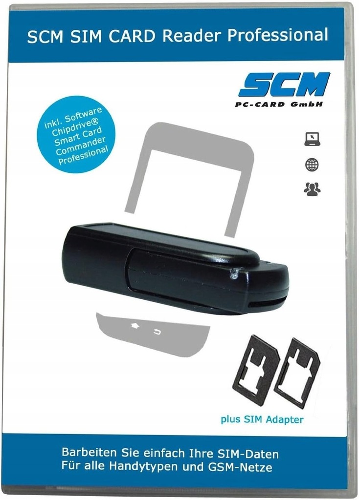- SCM SIM Card Reader Professional nadaje się w szczególności do szybkiego i łatwego przetwarzania danych zapisanych na karcie SIM telefonu komórkowego. Dzięki komputerowi PC możliwy jest wygodny dostęp do katalogów kart. Numery dzwoniące, krótkie wiadomości, dane konfiguracyjne można w mgnieniu oka odczytać, edytować i zapisać ponownie na karcie SIM, eliminować kłopotliwe kombinacje przycisków i wprowadzanie danych na telefonie.