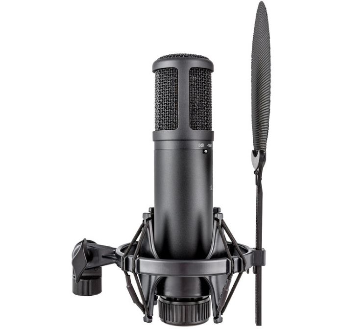 sE 2200 ma w zestawie sE Isolation Pack, w skład którego wchodzi specjalny uchwyt antywstrząsowy, zintegrowany pop-filtr i adapter gwintu, pozwalający na montaż na każdym statywie mikrofonowym.
