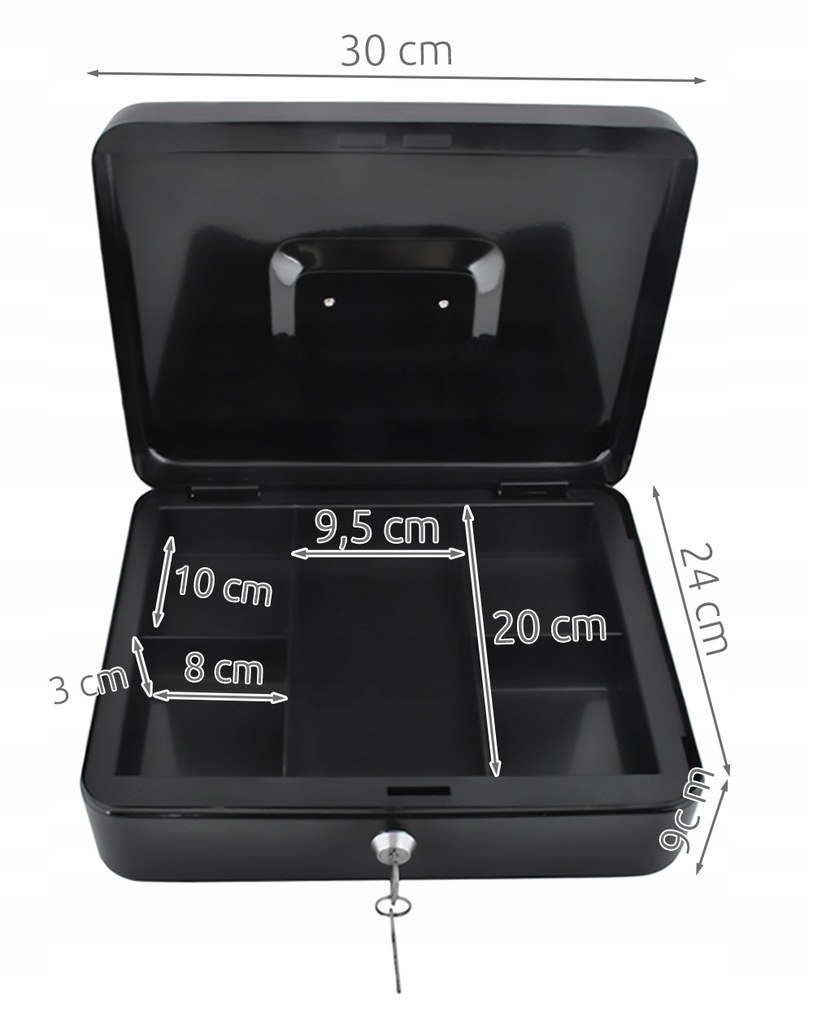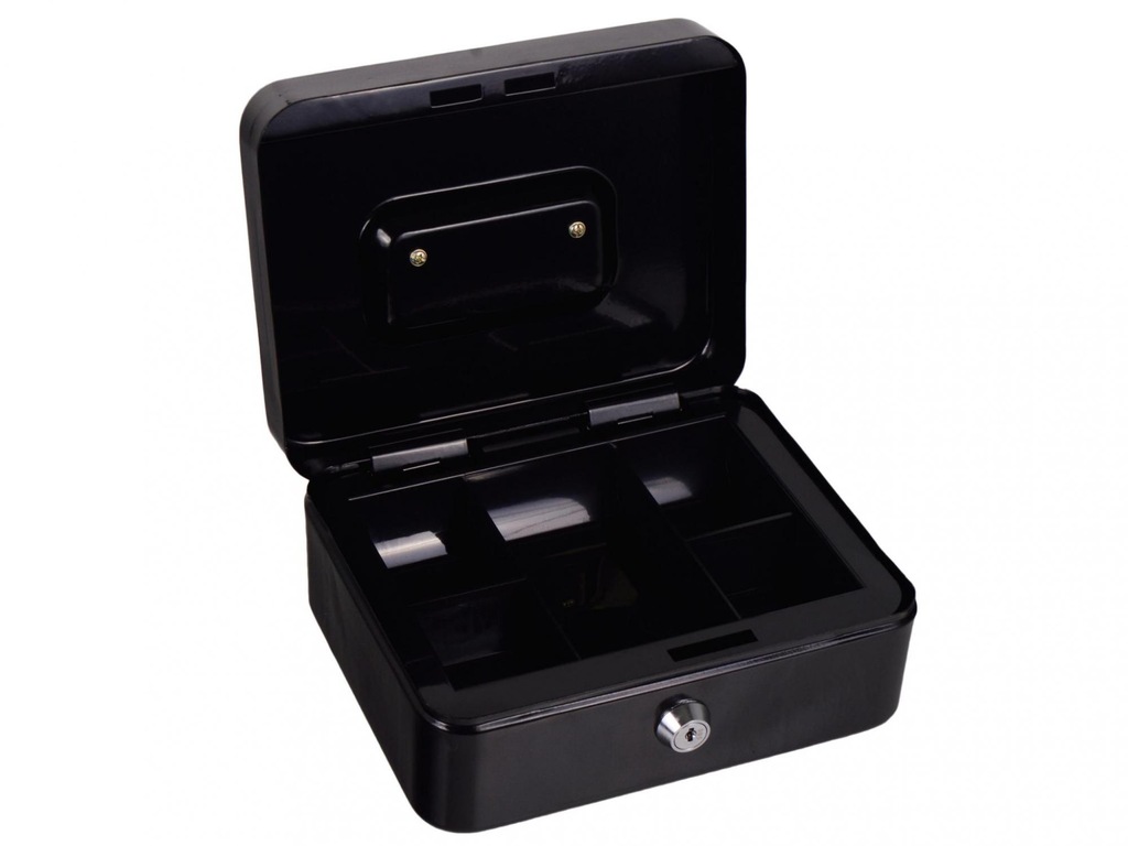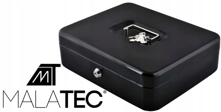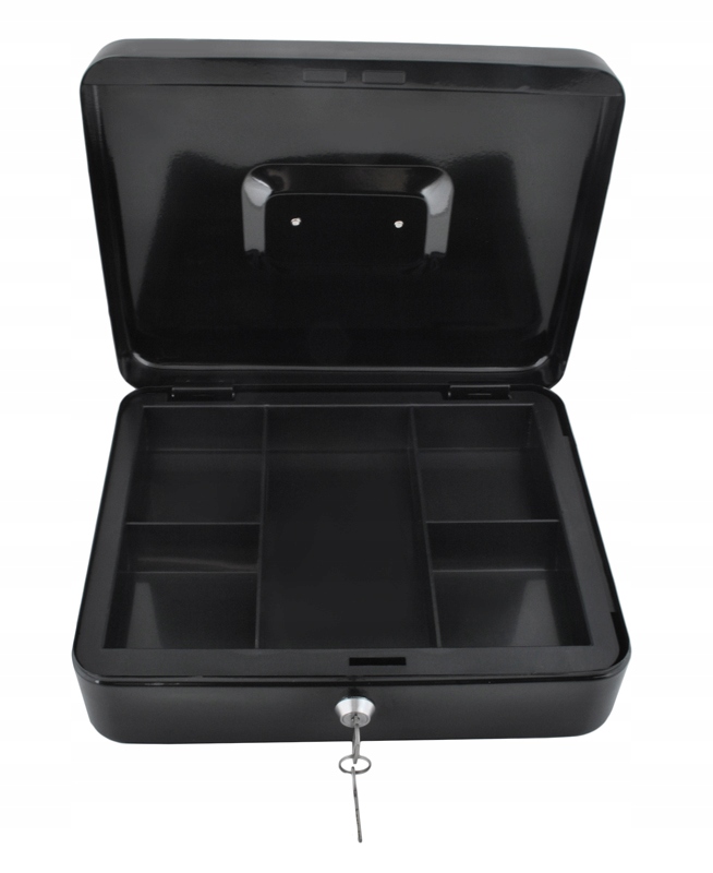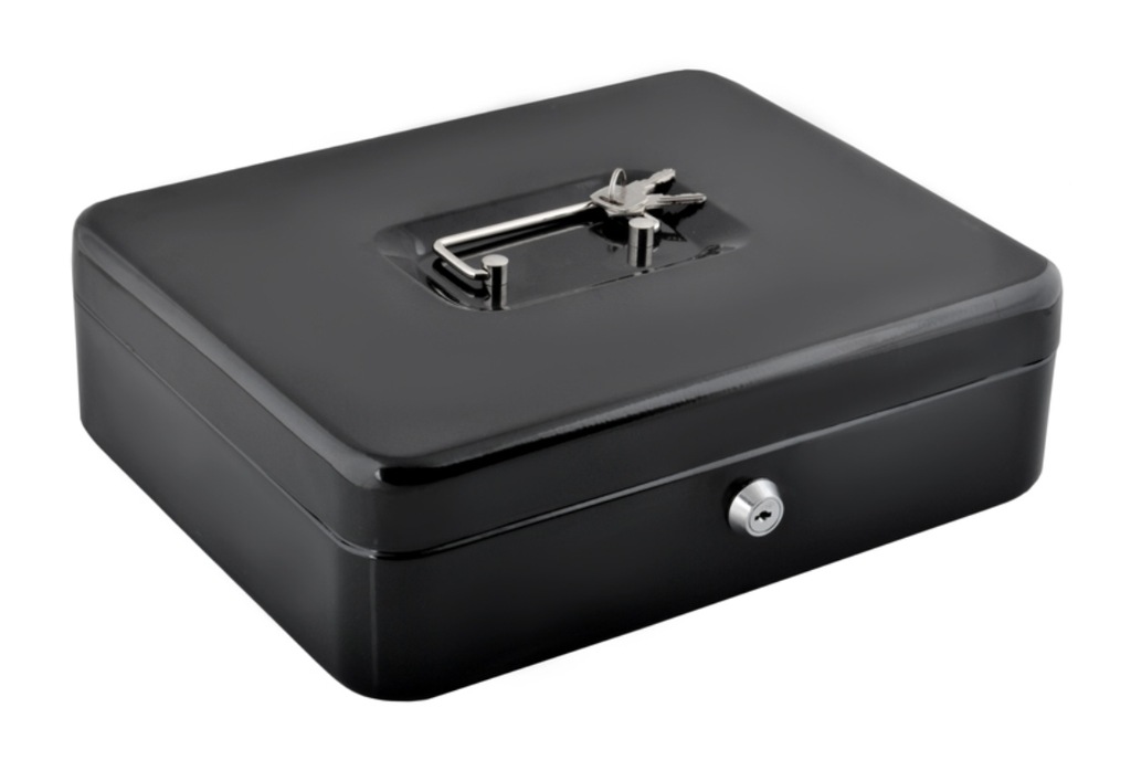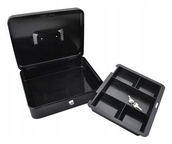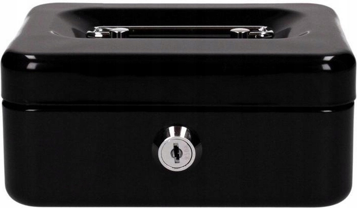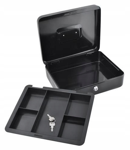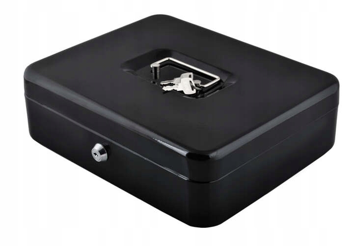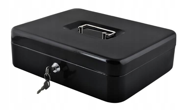 Metalowa kasetka idealna do przechowywania pieniędzy, dokumentów lub innych drobnych przedmiotów.