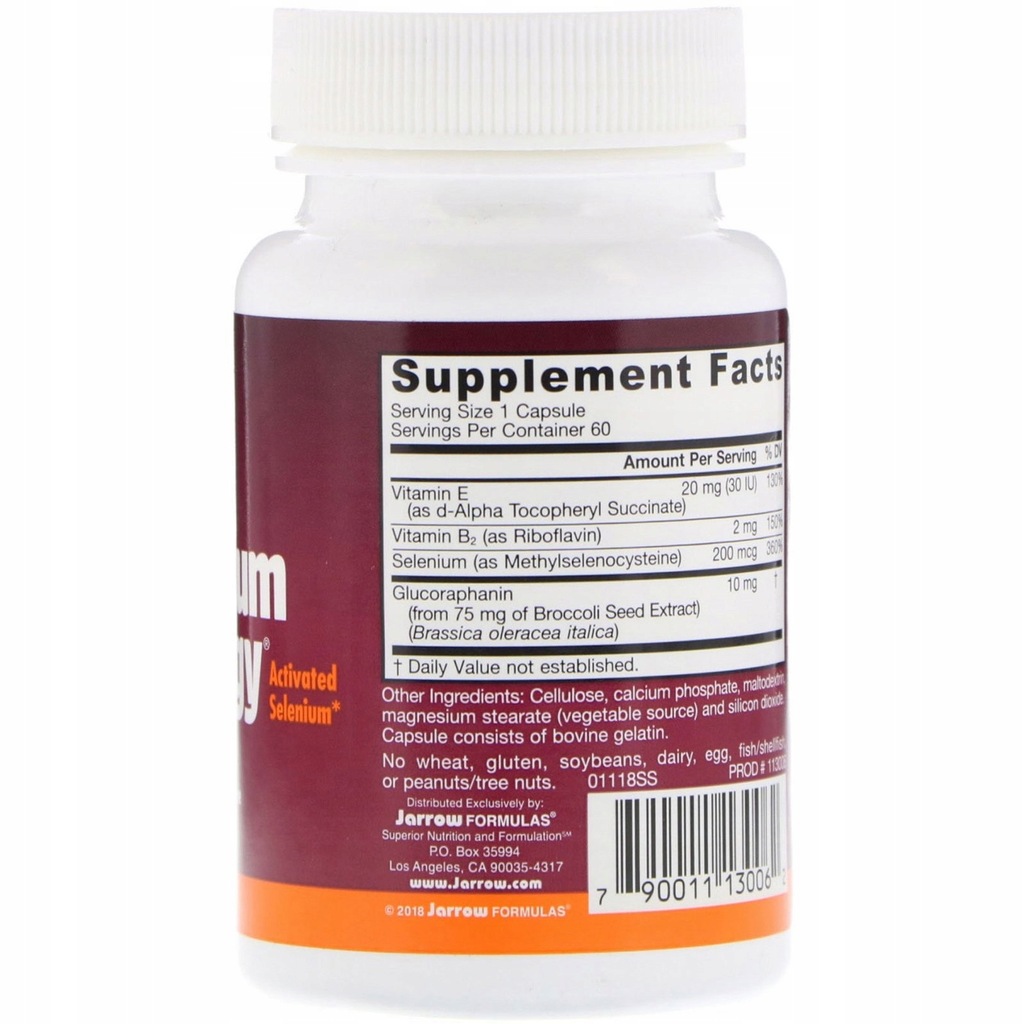 SKŁADNIKI: Witamina E (bursztynian D-alfa-tokoferylu), Glukorafanina (z 75 mg ekstraktu z nasion brokuła) (Brassica oleracea italica), Ryboflawina, Selen (jako metyloselenocysteina), substancja wypełniająca: celuloza mikrokrystaliczna, żel celulozowy; otoczka kapsułki (żelatyna wołowa), substancja przeciwzbrylająca: fosforany wapnia; maltodekstryna, substancje przeciwzbrylające: sole magnezowe kwasów tłuszczowych, dwutlenek krzemu.