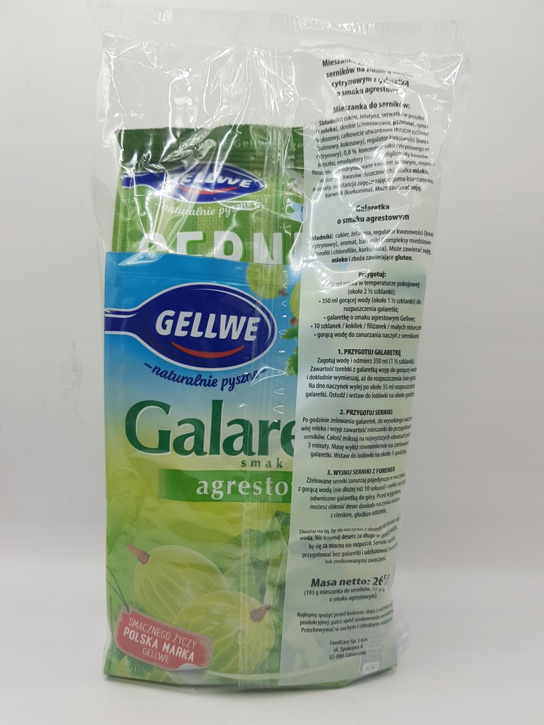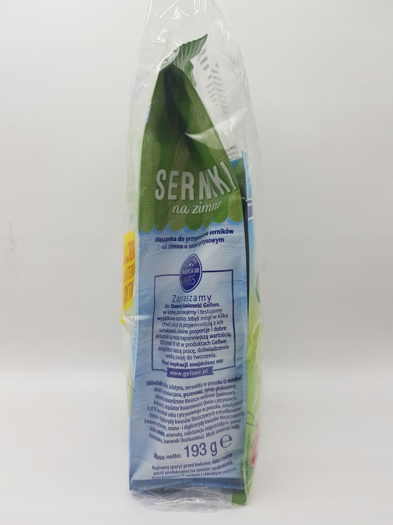 Gotowa mieszanka do przygotowania serników na zimno o smaku cytrynowym z galaretką o smaku agrestowym.