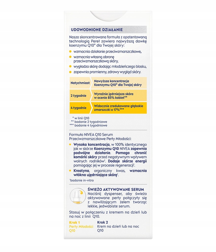 NIVEA Q10 Ujędrnienie przeciwzmarszczkowe serum do twarzy Perły Młodości zapewnia silne działanie przeciwzmarszczkowe dzięki ujędrniającej formule z KOENZYMEM Q10 i KREATYNĄ. Serum do twarzy wzmacnia działanie przeciwzmarszczkowe kremów do twarzy, wspiera własną obronę przeciwzmarszczkową skóry, wygładza dodając młodzieńczego blasku oraz zapewnia promienny i zdrowy wygląd skóry. Chroni komórki skóry przed negatywnym wpływem wolnych rodników*. Serum NIVEA dodaje skórze energii pomagając jej w procesie regeneracji*. Dzięki Kreatynie wzmacnia włókna ujędrniające skórę*. Unikalna formuła Pereł zawiera najwyższą dawkę Koenzymu Q10 w linii NIVEA Q10. W rezultacie nawet głębokie zmarszczki są widocznie zredukowane o 17% już po 4 tygodniach***, a skóra jest zauważalnie jędrniejsza w ocenie 85% kobiet**. Perły błyskawicznie nawilżają skórę i wygładzają cerę.