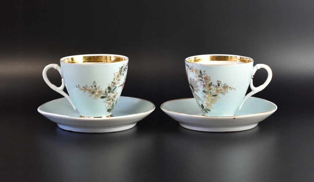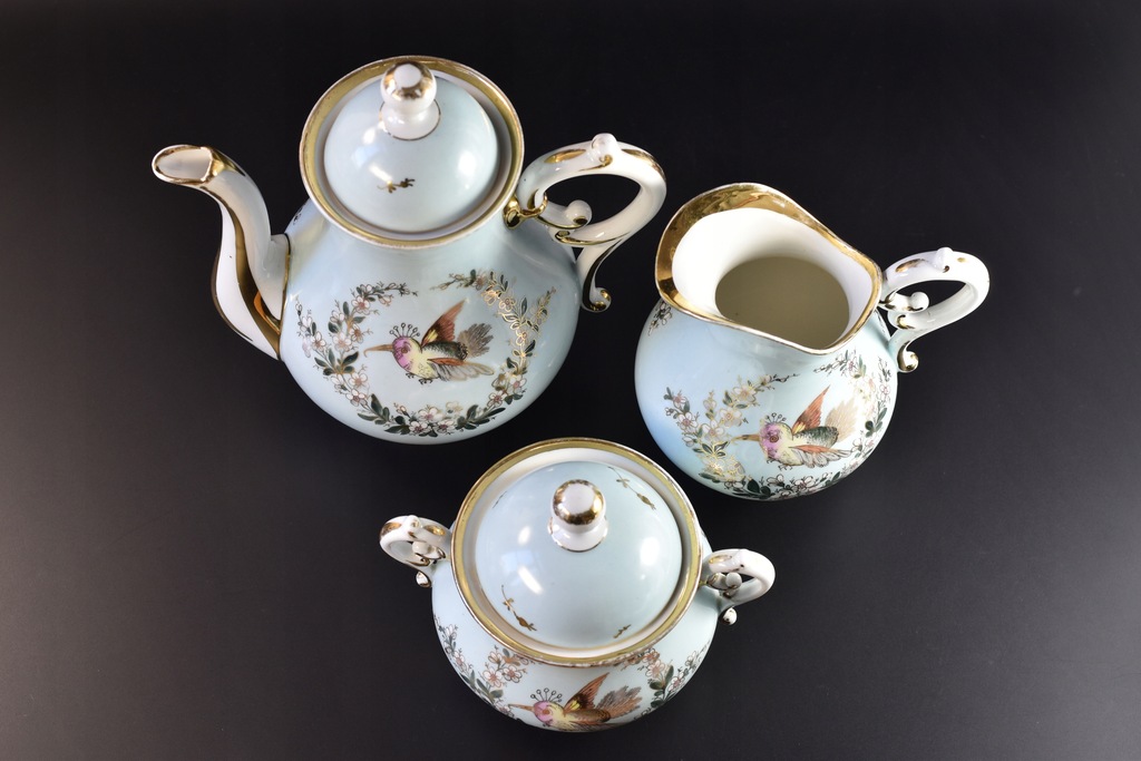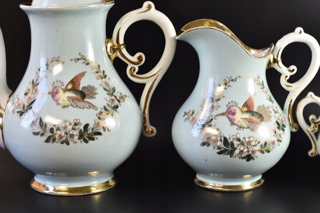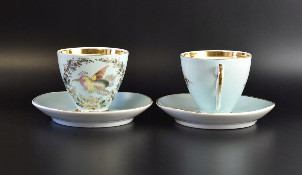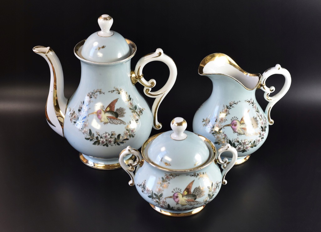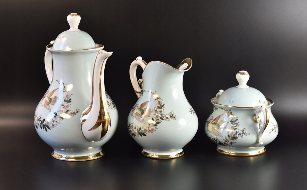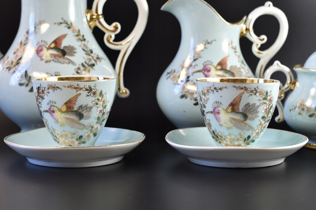 Bogato zdobiony serwis tête-à-tête z dziewiętnastowiecznej Bohemii. Barwne zdobienia zaakcentowane złotą kreską osadzone zostały na delikatnym, jasnoturkusowym tle. Całości towarzyszą złote i białe akcenty. Opływowe i zaokrąglone kształty zakończone zawijanymi uchwytami. Porcelana jest ręcznie malowana.