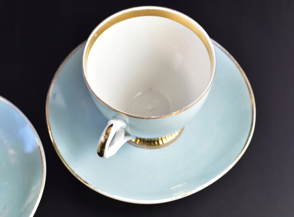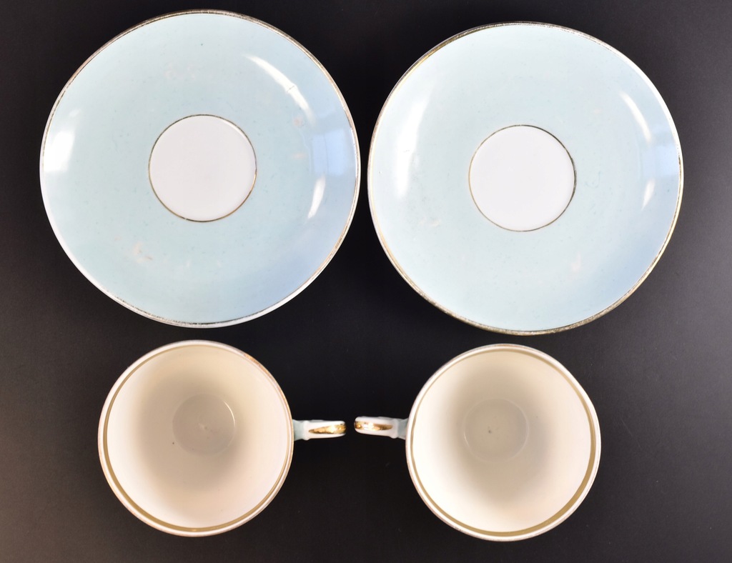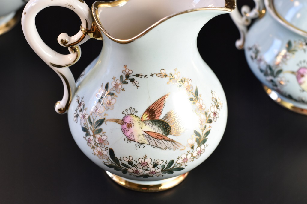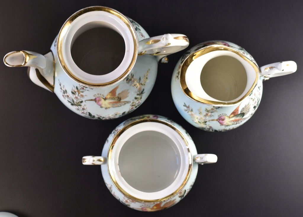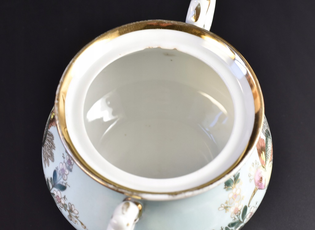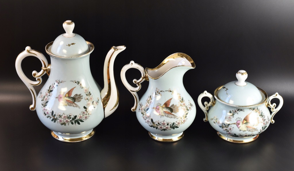 Stan: serwis jest bardzo ładnie zachowany z małymi, wiekowymi śladami użytkowania czy przetarciami złoceń (trochę większe na spodkach); mejscami widać małe niedociągnięcia z produkcji (np. na rancie jednej z filiżanek), czy nierówności w formach; delikatne uszczypnięcia na wewnętrznym rancie cukiernicy; mlecznik ma z jednej strony na brzuścu ryski włosowate.