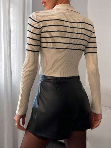 SHEIN TOP DAMSKI BEŻOWO CZARNY W PASKI Z KOŁNIERZYKIEM XS