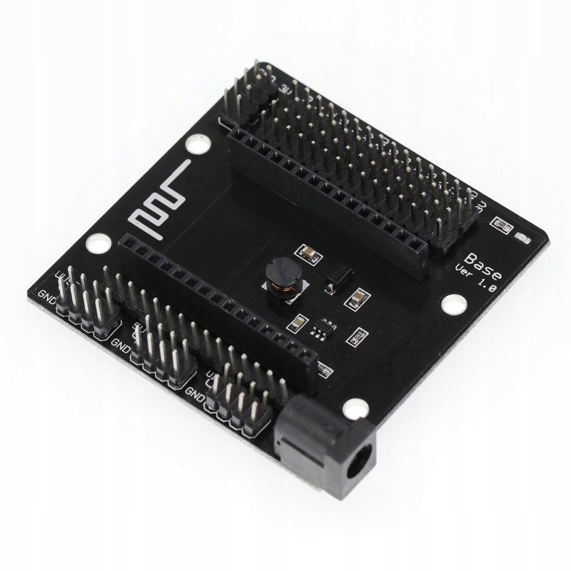 Shield dla ESP8266 NodeMCU V3. Płytka posiada wbudowany stabilizator na 5V/1A, gniazdo zasilania 5.5/ 2.1 mm DC, diodę LED sygnalizującą zasilanie układu. Po bokach znalazły się wyprowadzenia wszystkich złączy mikrokontrolera oraz po przeciwnej stronie wyprowadzenia napięcia.