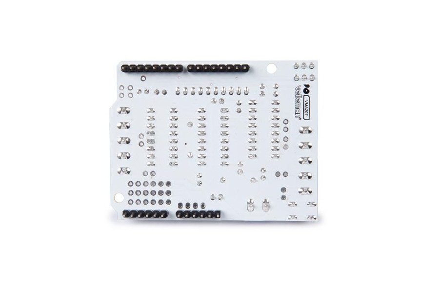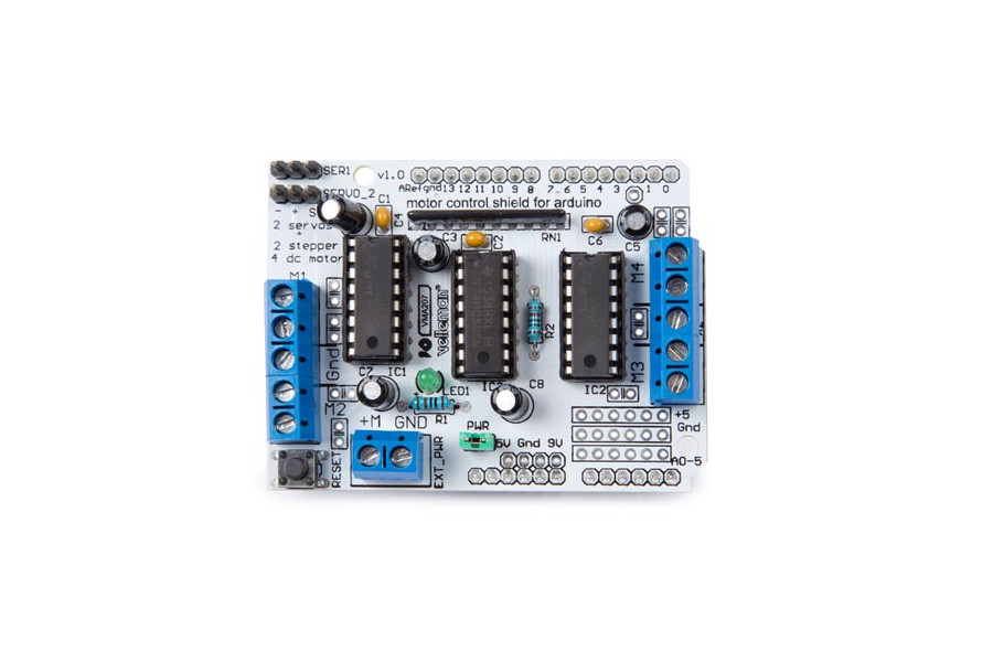 Shield do kontroli silnika - L293D składa się z dwóch sterowników L293D i jednego rejestru przesuwnego 74HC595. Rejestr przesuwny rozszerza 3 piny Arduino do 8 pinów kontrolujących kierunek pracy sterowników silnika. Pin "output enable" L293D jest bezpośr