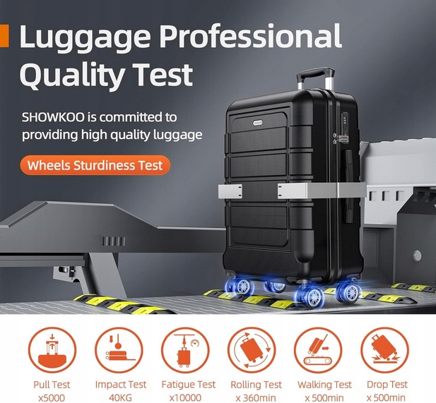 【Nowa walizka podróżna Ulepszona --- Super trwałe zamki i koła】 Nowo ulepszone, wysokiej jakości zamki i kółka obrotowe 360° przenoszą trwałość walizki na bagaż podręczny SHOWKOO na nowy poziom. Ulepszony pleciony zamek błyskawiczny z zębami łańcuszkowymi zapewnia bezpieczne ugryzienie i uniknięcie rozdarcia. Pogrubione łożyska i miękki TPU tworzą podwójny rząd kół 360°, które działają płynnie i cicho. Idealny towarzysz długich i biznesowych podróży