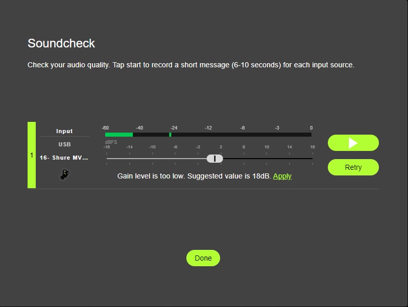 - Soundcheck: Sprawdź ustawienie wzmocnienia mikrofonu i zoptymalizuj je za pomocą funkcji Soundcheck.