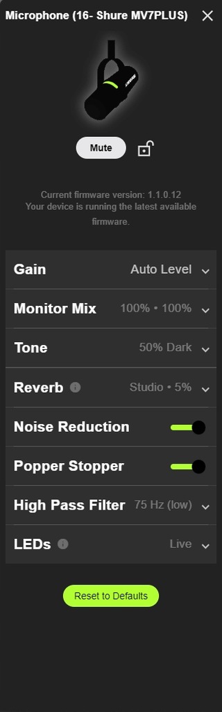 Aplikacja komputerowa umożliwia użytkownikom skonfigurowanie następujących funkcji wbudowanego procesora DSP w MV7+ po podłączeniu go przez USB-C do komputera.