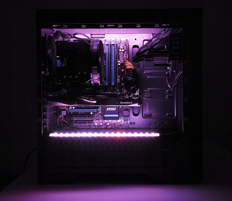 Zestaw używany w bdb stanie technicznym i wizualnym. Paski LED używane na magnes, więc taśma z klejem nietknięta. Zapakowane w oryginalne pudełko (bez plastikowego wypełnienia). Dowód zakup ze sklepu Electro z dnia: 10-11-2019. Na gwarancji 24 mc od dnia zakupu. Sprzedaję bo zmieniłem obudowę na taką bez szkła hartowanego. Komputer ze zdjęcia nr 4 nie jest na sprzedaż, jest tylko przykładem jak można podświetlić komputer.