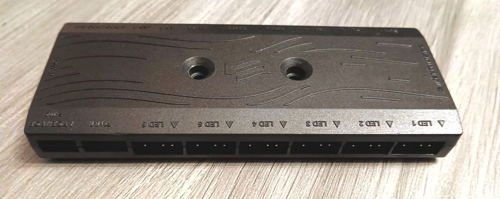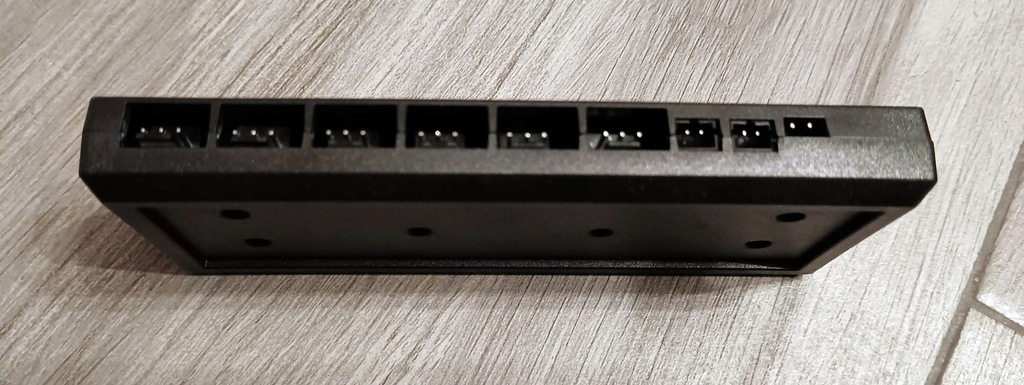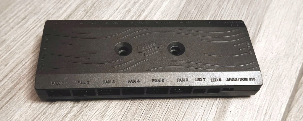 Kontroler wentylatorów i oświetlenia RGB. Można go przyczepić na taśmę lub przykręcić śrubami wewnątrz obudowy.