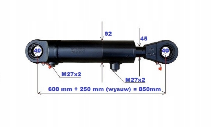 - Całkowita długość siłownika po rozłożeniu 850 mm