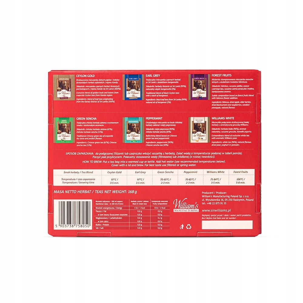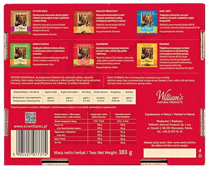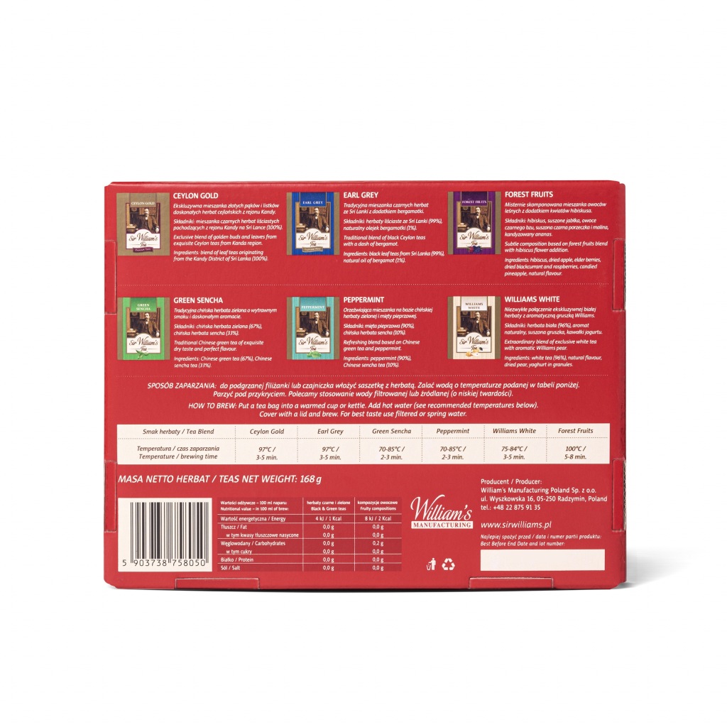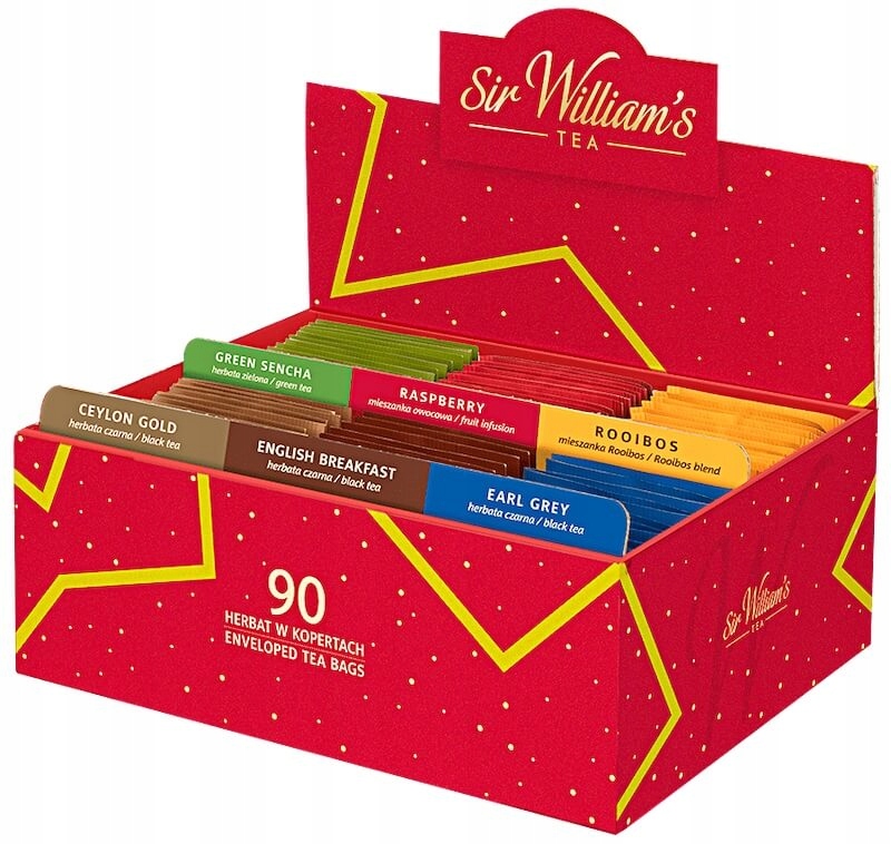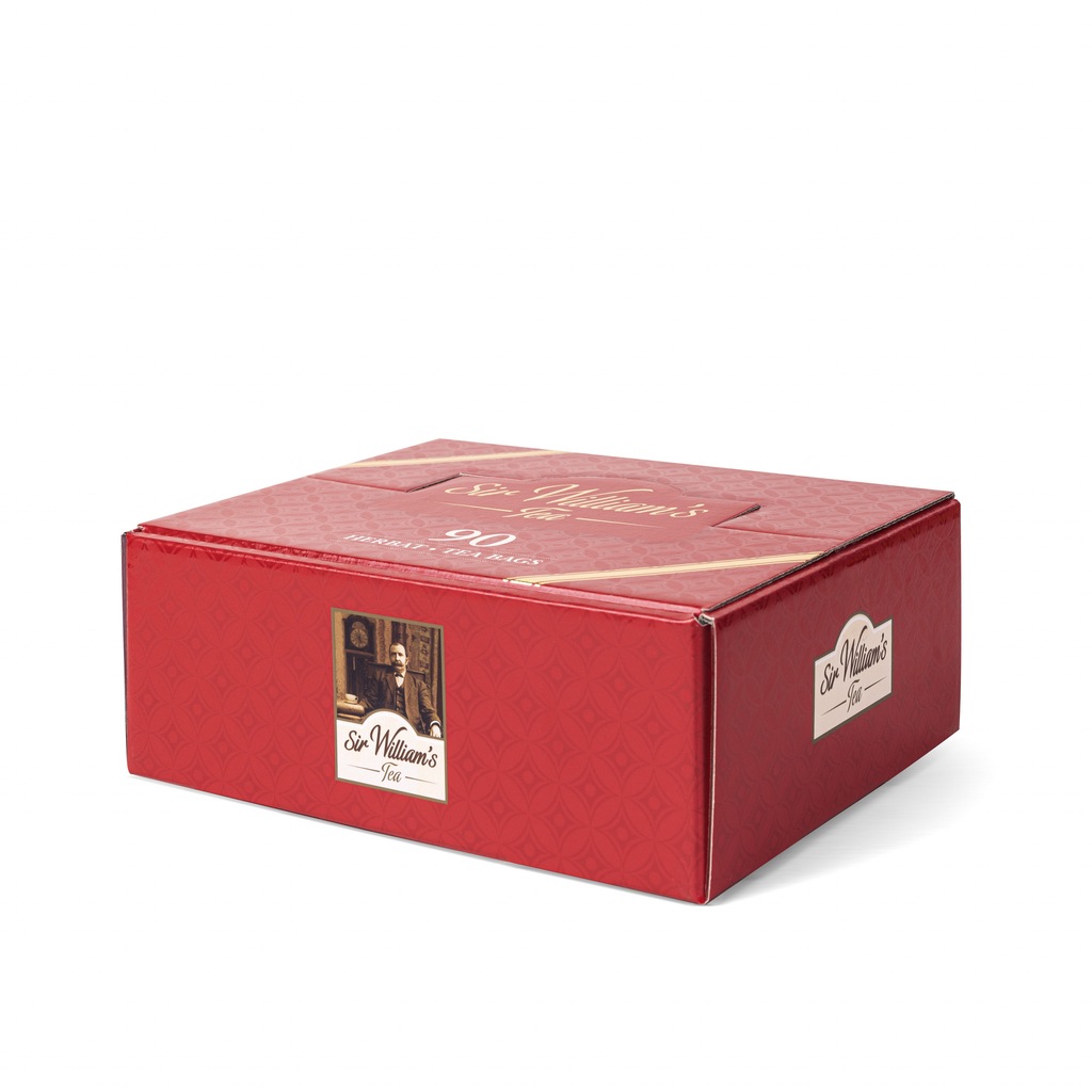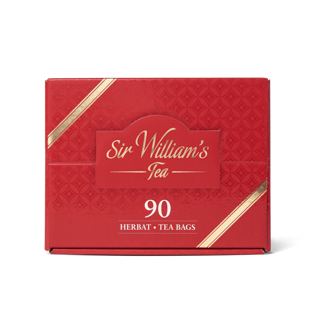 - 90 herbat Sir Williama's Tea w aluminiiowych kopertach, zapakowanych w ładne, czerwone pudełko upominkowe,