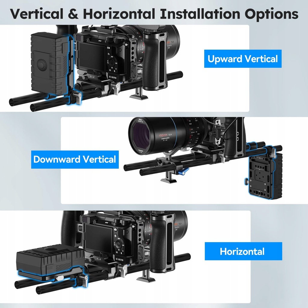 Oferujemy uniwersalną stację bazową SIRUI V-Lock i zestaw klinów, który zapewni niezawodne zasilanie aparatu. Zintegrowane złącze uniwersalnej baterii V Mount z podwójnymi uchwytami na pręt 15mm umożliwia szybki i stabilny montaż. Dodatkowo, zestaw posiada wiele punktów montażowych, co sprzyja kreatywnej konfiguracji.