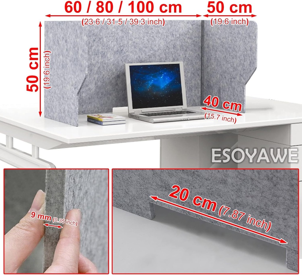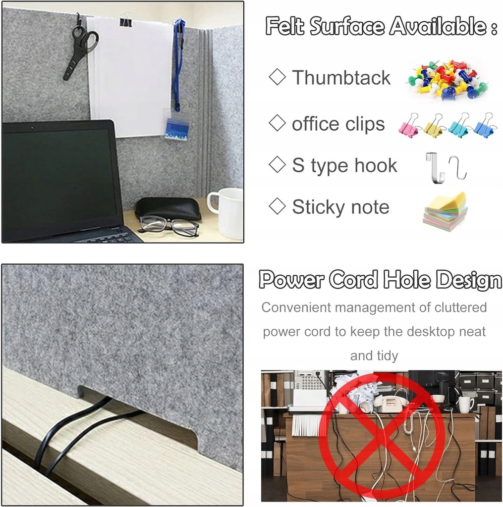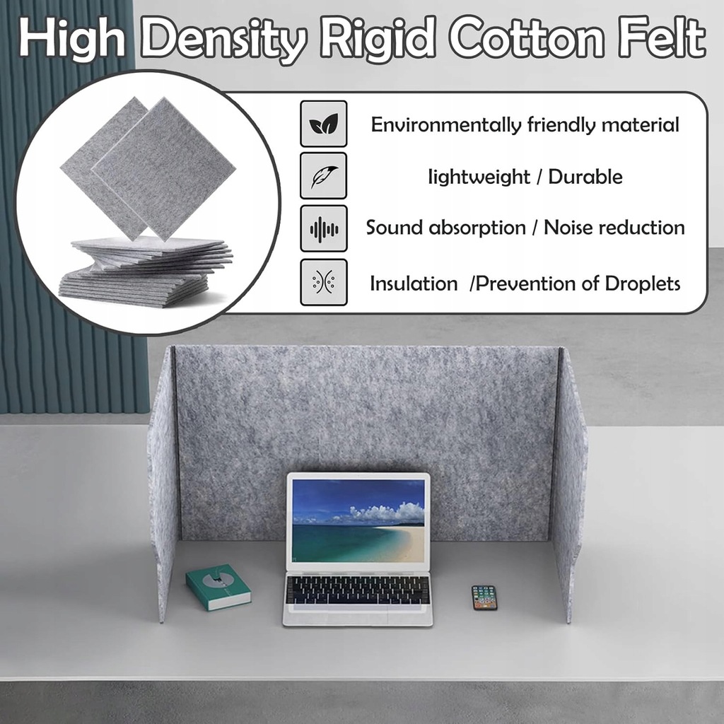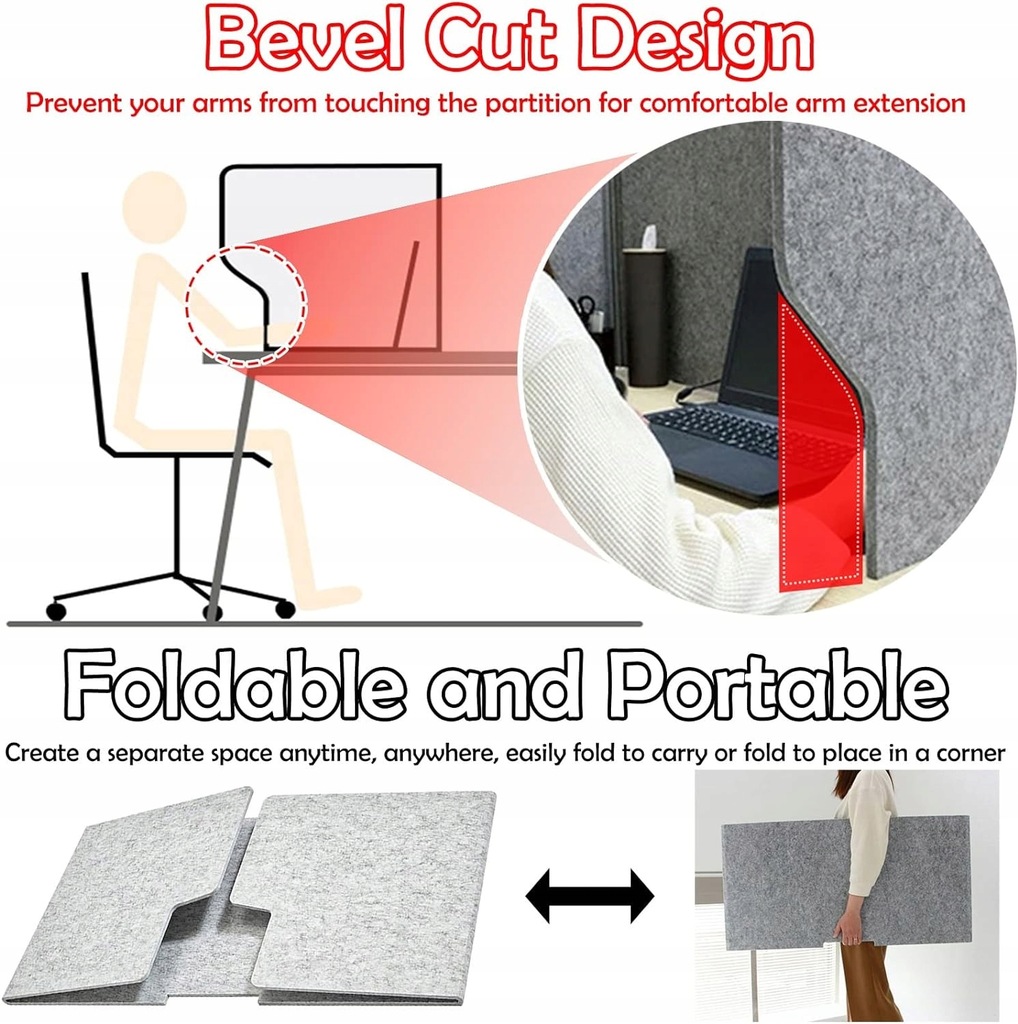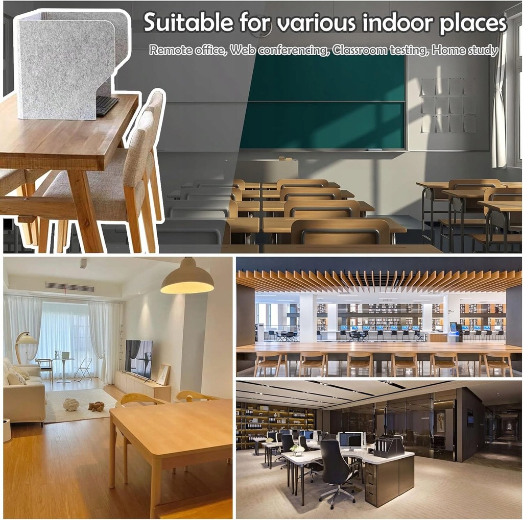 Przegroda biurkowa moe skutecznie redukowa haas w otoczeniu wykonana ze sztywnej pyty pilniowej poliestrowej o wysokiej gstoci lekka trwaa dwikochonna izolacja cieplna Ekran dziaowy na biurko pokrywajcy trzy strony pulpitu skutecznie zapobiega ingerencji innych i chroni prywatno dziki czemu moesz skupi si na pracy nauce graniu w gry i ogldaniu filmów Bariera dziaowa na biurko z humanizowanym wyciciem skutecznie zapobiega czstym kolizjom okci o przegrod umoliwiajc wygodne rozciganie ramion. Zapewnia bezstresowe i atwe skupienie si na przestrzeni Wolnostojcy panel prywatnoci jest zarezerwowany dla otworów dostpu do kabli zasilajcych co uatwia zarzdzanie zagraconymi kablami zasilajcymi i utrzymanie porzdku na biurku. Jednoczenie filcowa powierzchnia przegrody moe by uywana do wklejania karteczek samoprzylepnych i wieszania dokumentów poprawiajc wydajno i wygod biura Skadane przegrody biurkowe nadaj si do rónych miejsc wewntrznych powszechnie stosowanych w domach biurach bibliotekach salach lekcyjnych restauracjach hotelach itp. W kadej chwili mona atwo stworzy niezalen przestrzeń biurow