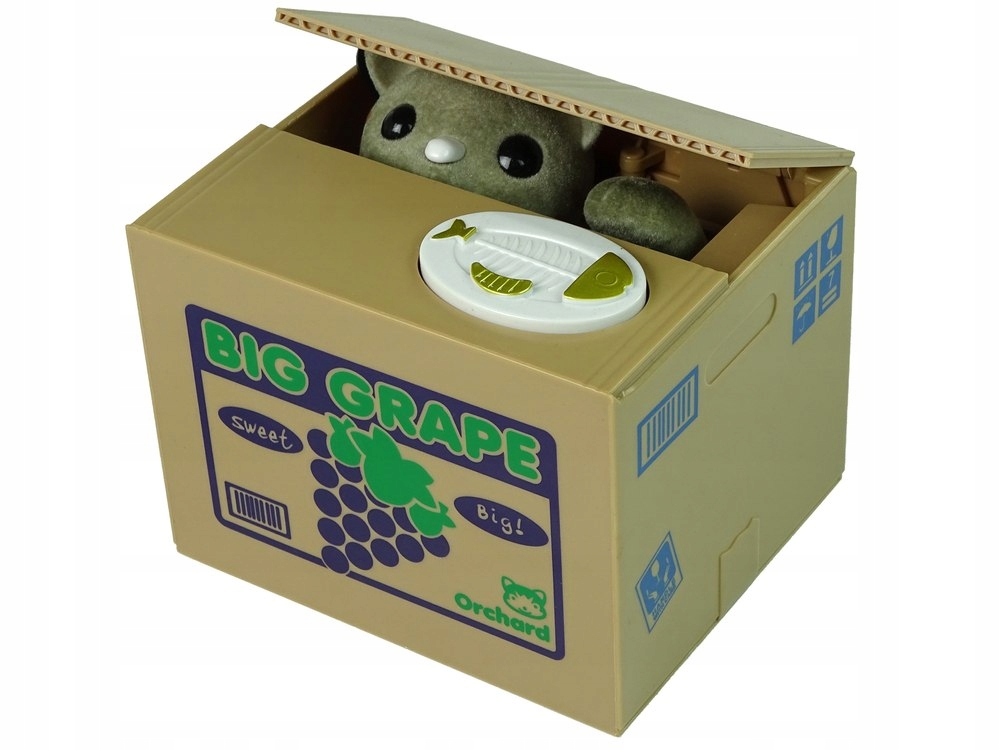 Naciśnij przycisk na budce a kot dźwignie pokrywkę i łapką wciągnie pieniążka.