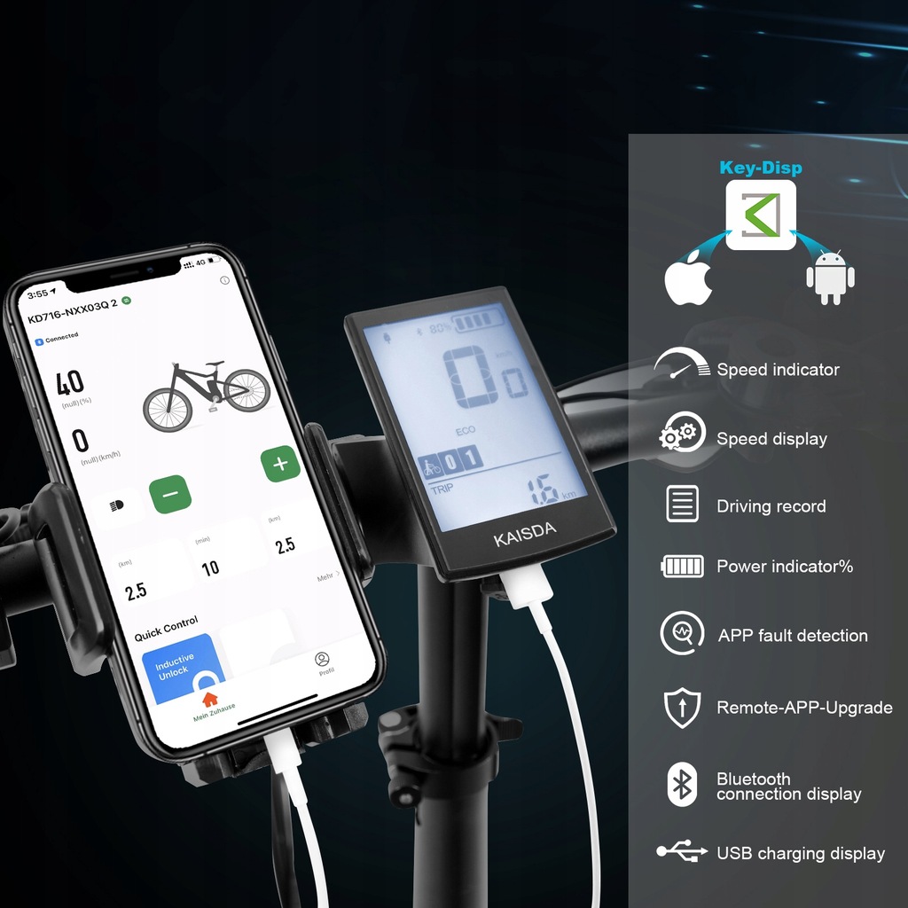 Wyposażony w inteligentny wielofunkcyjny wyświetlacz LCD, który może wyświetlać moc, prędkość, przebieg i inne parametry w czasie rzeczywistym i może być ustawiony do jazdy ze stałą prędkością, gdy droga jest płaska. Dzięki Bluetooth można podłączyć telefon komórkowy, aby kontrolować pełne informacje roweru, uczynić jazdę bardziej wygodną.