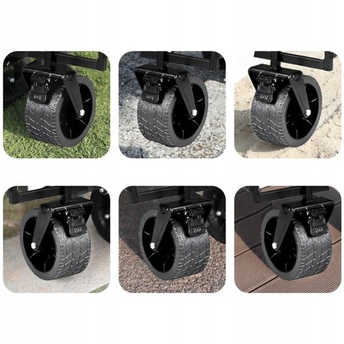 - SZEROKIE SKRĘTNE KOŁA - wózek wyposażony jest w szerokie bieżnikowane koła wykonane z wysokiej jakości materiału PP, które zapewniają stabilność i łatwość manewrowania na różnych powierzchniach. Koła z przodu wózka są skrętne w pełnym zakresie 360 stopni, co umożliwia precyzyjne sterowanie i łatwe manewrowanie w ciasnych przestrzeniach. Ponadto posiadają hamulce / blokady, co gwarantuje bezpieczeństwo i stabilność podczas załadunku oraz rozładunku. Duże, bieżnikowane koła to pewność, że wózek pokona zarówno piaszczystą plażę, jak i nieutwardzony grunt w ogrodzie.