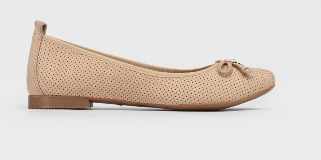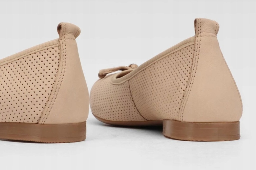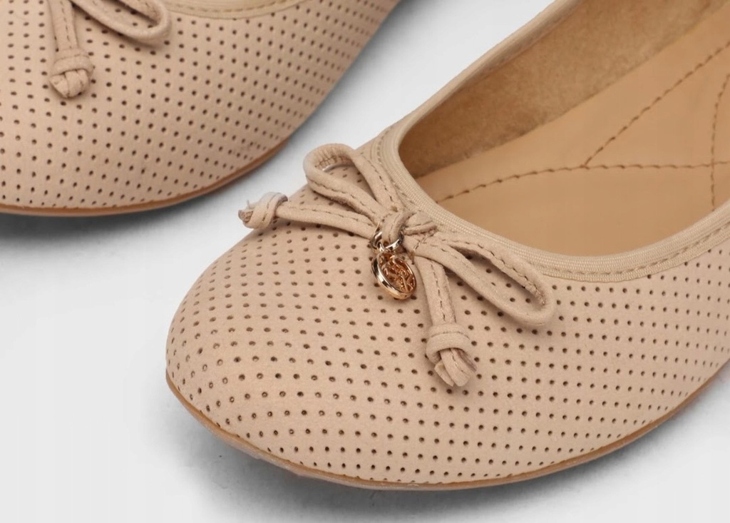 Beżowe skórzane półbuty firmy Lasocki z modnym wzorem wyciętych kropeczek wykończone kokardką z metalowym elementem. Baleriny mają rewelacyjne miękkie wkładki, które zapewniają wygodne użytkowanie przez cały dzień. Dzięki wyciętym kropeczkom balerinki są "oddychające".