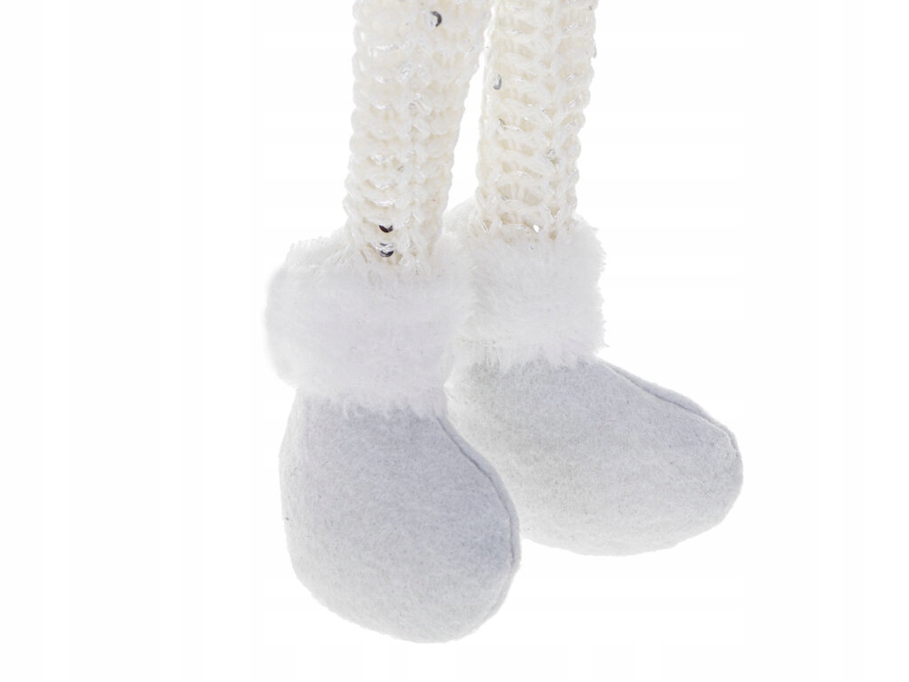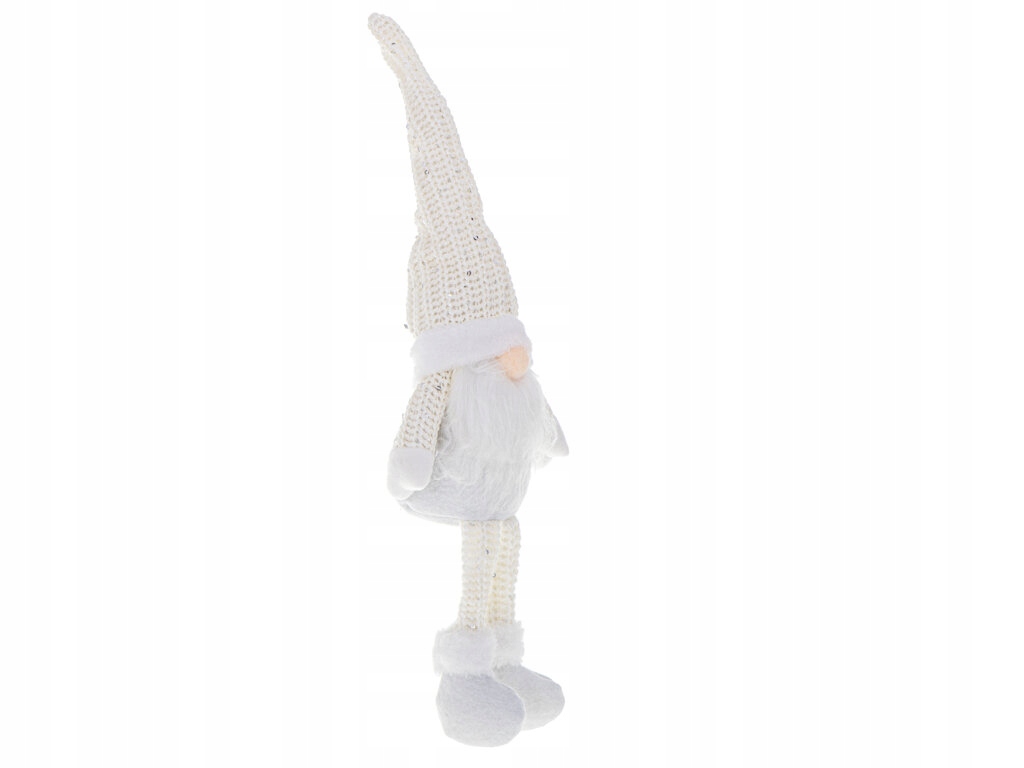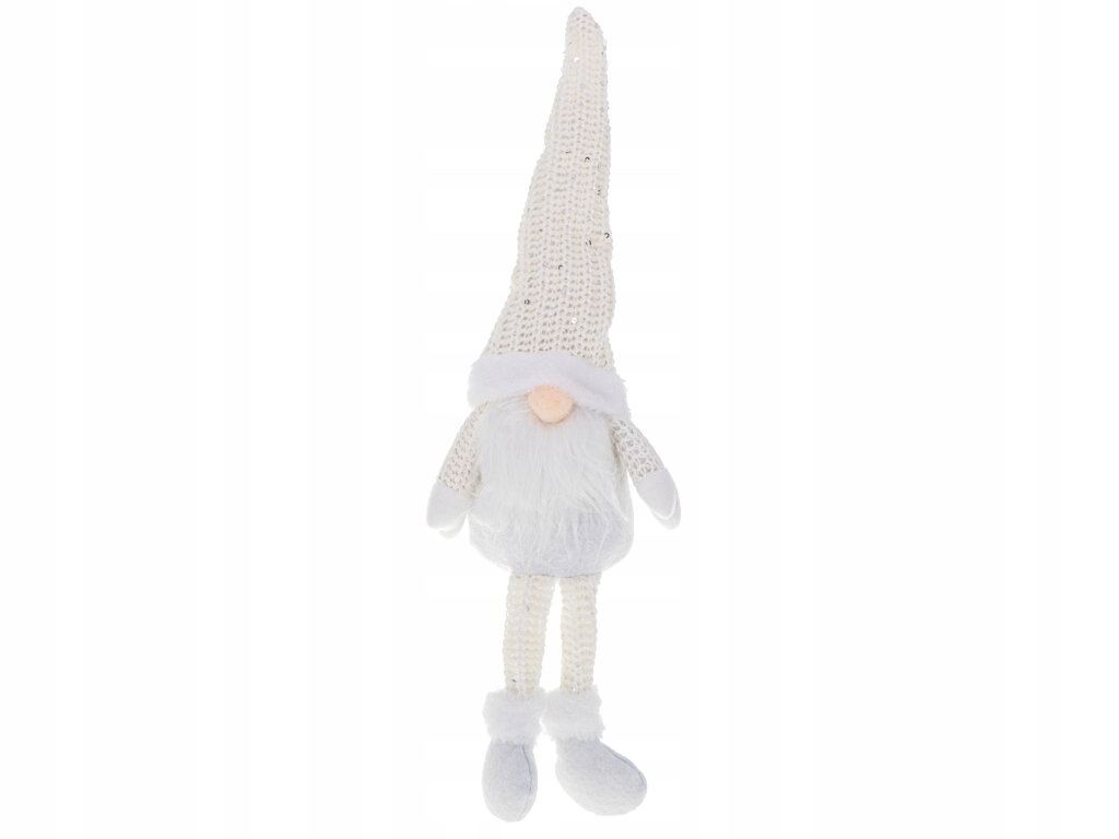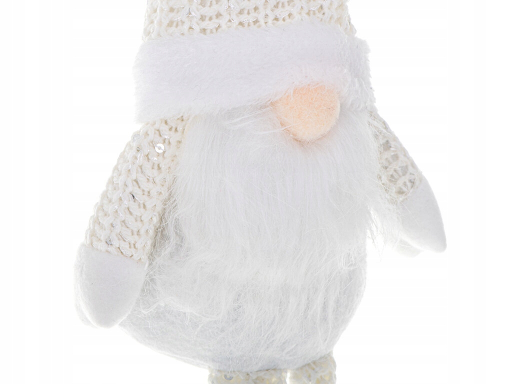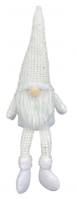 Rewelacyjny krasnal świąteczny z brodą. Wprowadzi świąteczną atmosferę do każdego wnętrza. Doskonała dekoracja na półkę lub choinkę. Kolor: biały. Wys. skrzata: 47cm. Dł. nóg: 14cm. Dł. czapki: 21cm.