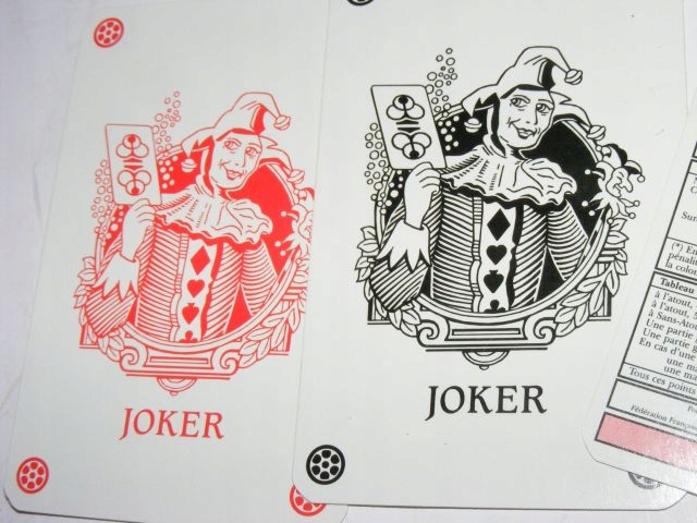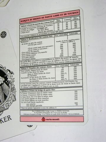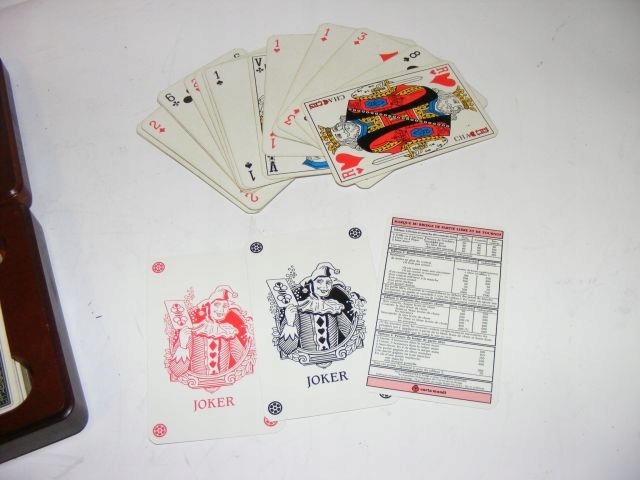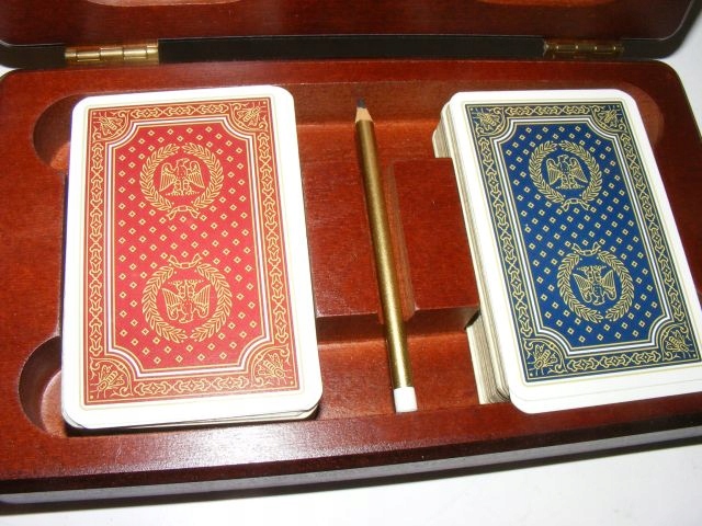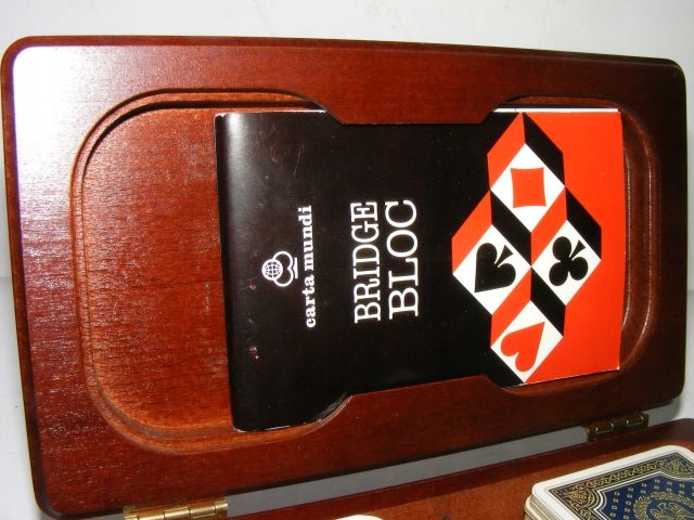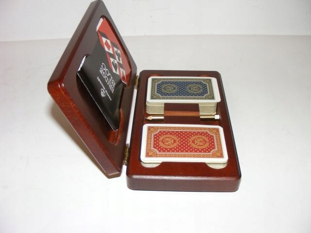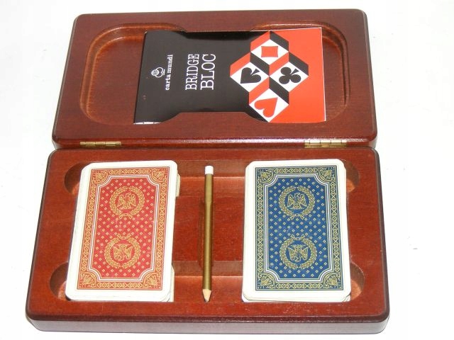 w środku 2 pełne talie z dżokerami i instrukcjami zapisu brydżowego,