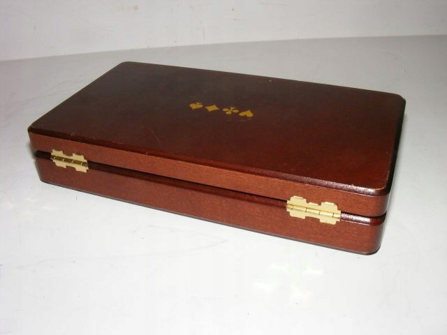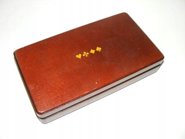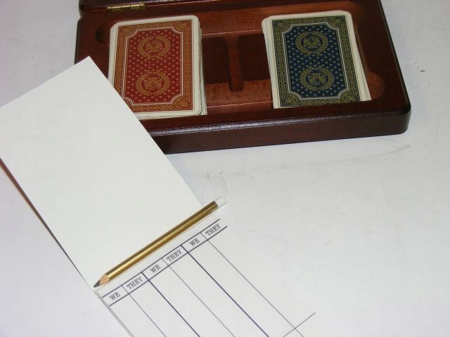 skrzyneczka z kartami do brydża, ołówkiem i notesikiem