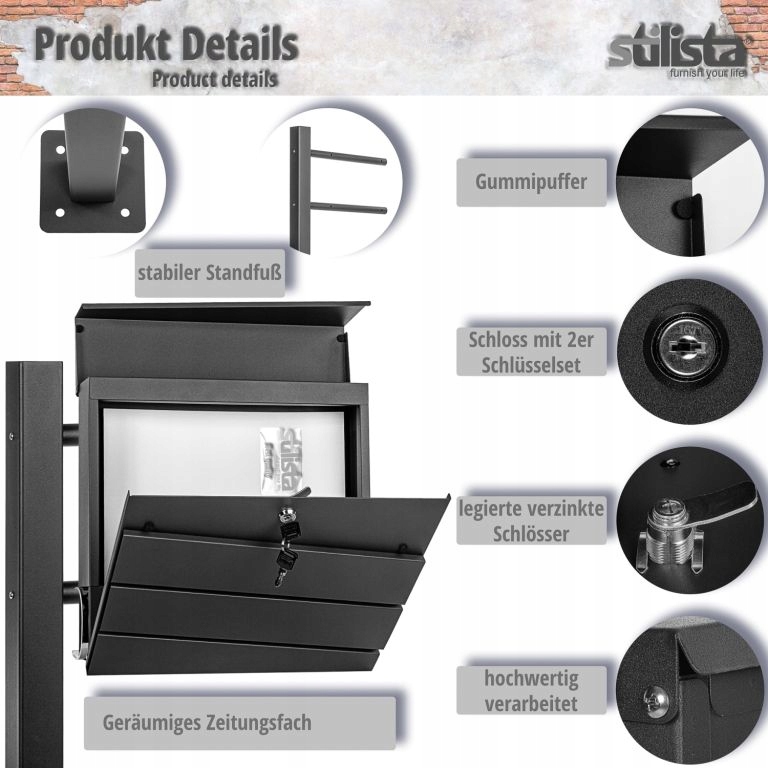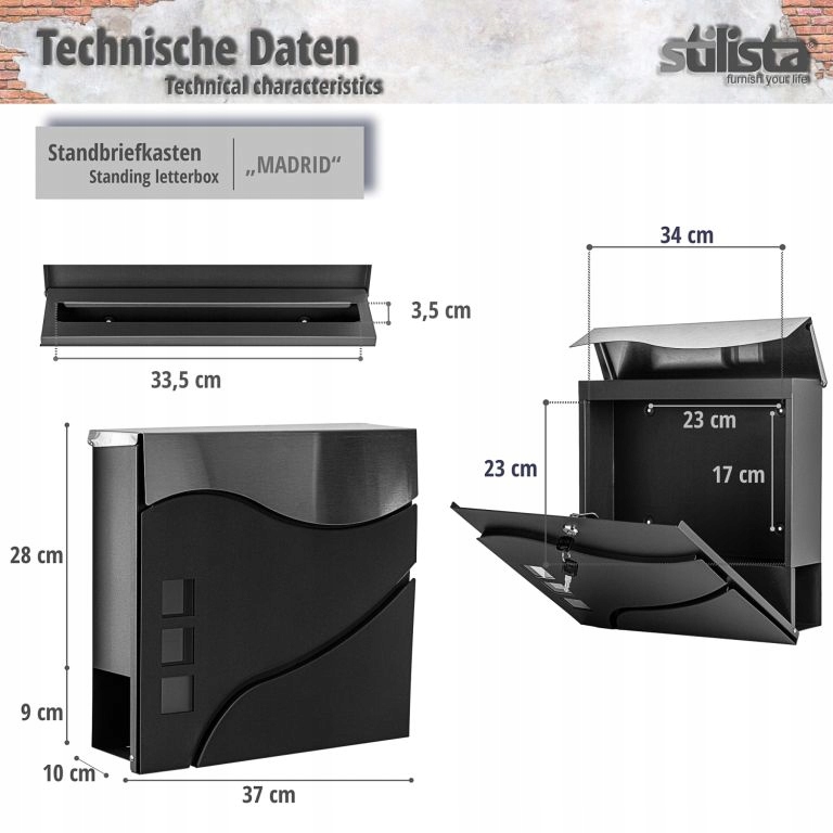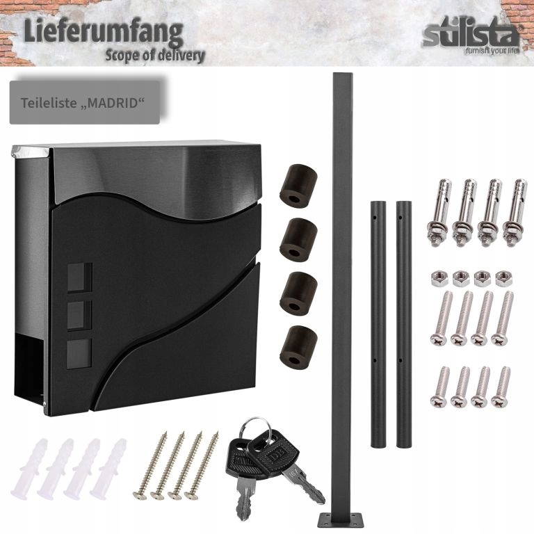 Skrzynka pocztowa Stilista o nowoczesnym wyglądzie oferuje mnóstwo miejsca na listy i pocztówki. Skrzynka ma duży otwór na listy i dlatego nadaje się również do dużych listów i grubszych kopert. Są w ten sposób chronione przed warunkami atmosferycznymi. Dzięki dołączonemu materiałowi montażowemu skrzynkę zmontujesz szybko i łatwo. Dzięki nodze możesz postawić skrzynkę osobno i nie potrzebujesz ściany do montażu.