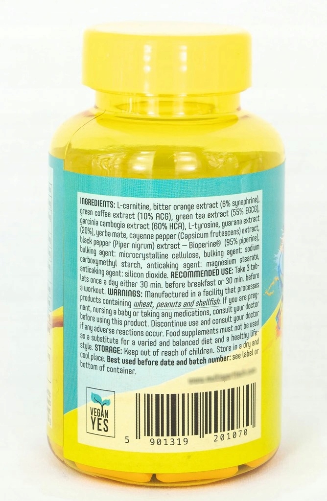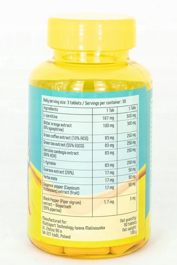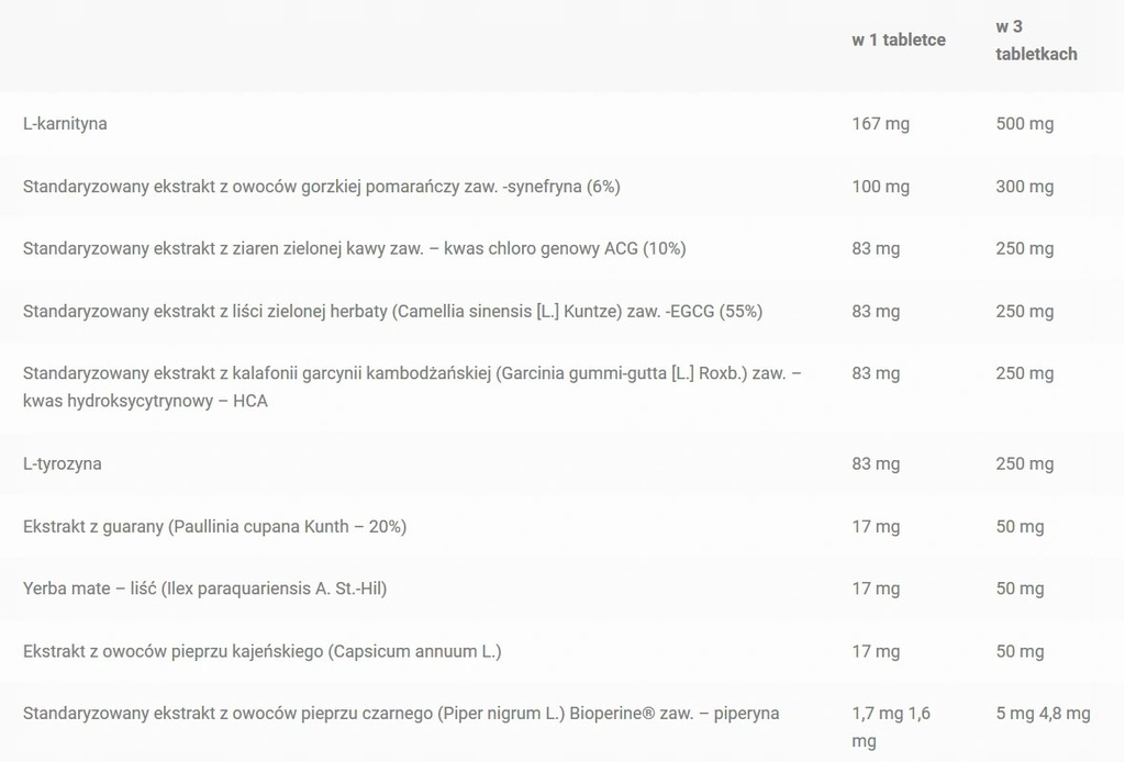 Składniki: L-karnityna, standaryzowany ekstrakt z owoców gorzkiej pomarańczy* zaw. 6% synefryny, standaryzowany ekstrakt z ziaren zielonej kawy zaw. 10 % kwas chlorogenowy ACG, standaryzowany ekstrakt z liści zielonej herbaty (Camellia sinensis [L.] Kuntze) zaw. 55% EGCG, standaryzowany ekstrakt z kalafonii garcynii kambodżańskiej (Garcinia gummi-gutta [L.] Roxb.) zaw. 60 % kwas hydroksycytrynowy – HCA, L-tyrozyna, ekstrakt z guarany (Paullinia cupana Kunth – 20%), yerba mate – liść (Ilex paraquariensis A. St.-Hil), ekstrakt z owoców pieprzu kajeńskiego (Capsicum annuum L.), substancja wypełniająca – celuloza mikrokrystaliczna, standaryzowany ekstrakt z owoców pieprzu czarnego (Piper nigrum L.) Bioperine® zaw. 95% piperyny, substancja wypełniająca – sól sodowa karboksymetylocelulozy, substancja przeciwzbrylająca – sole magnezowe kwasów tłuszczowych, substancja przeciwzbrylająca – dwutlenek krzemu.